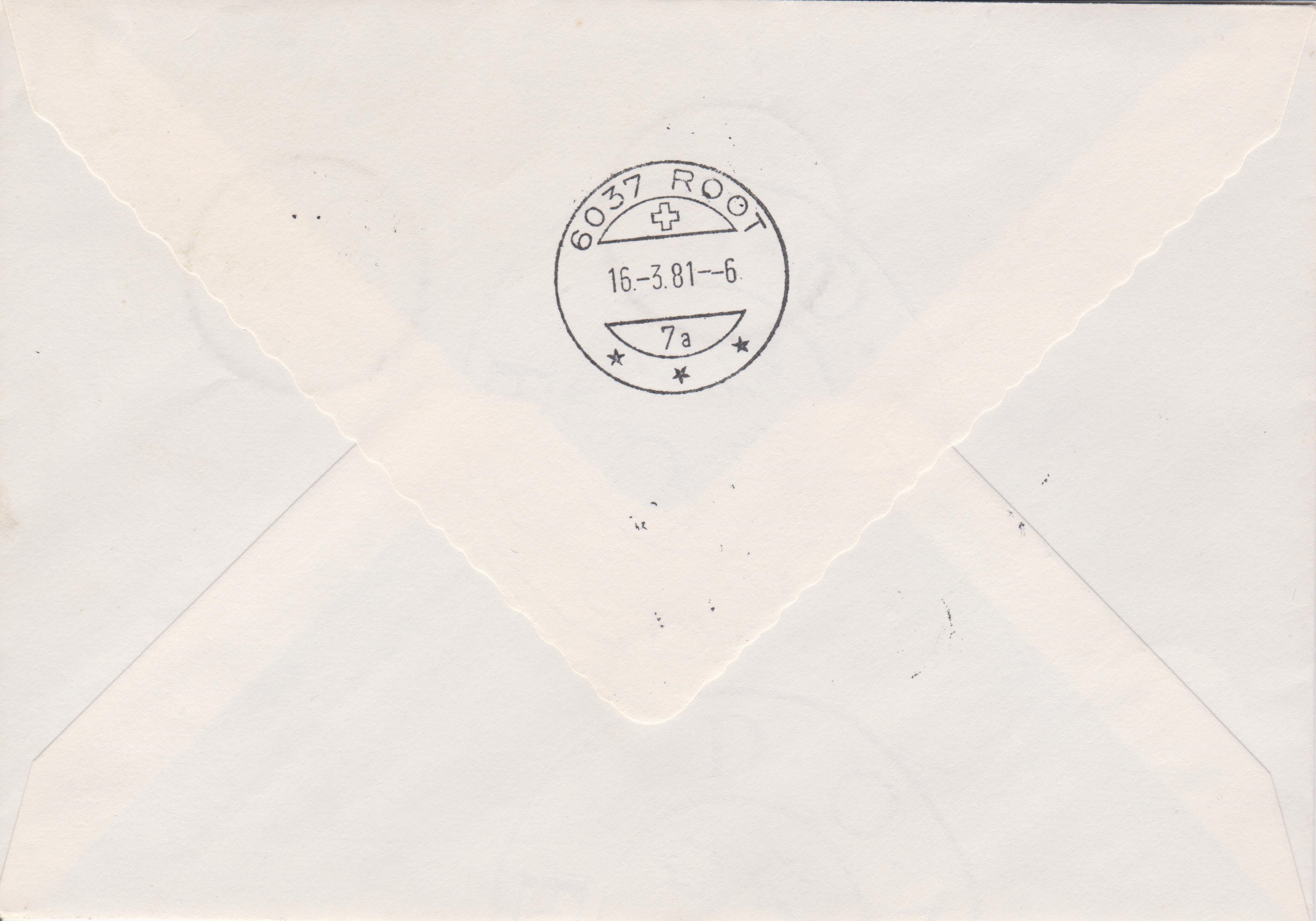 In 6037 ROOT in der Schweiz wurde am 16.03.1981 rückseitig ein Tagesstempel als Ankunftstempel abgeschlagen: