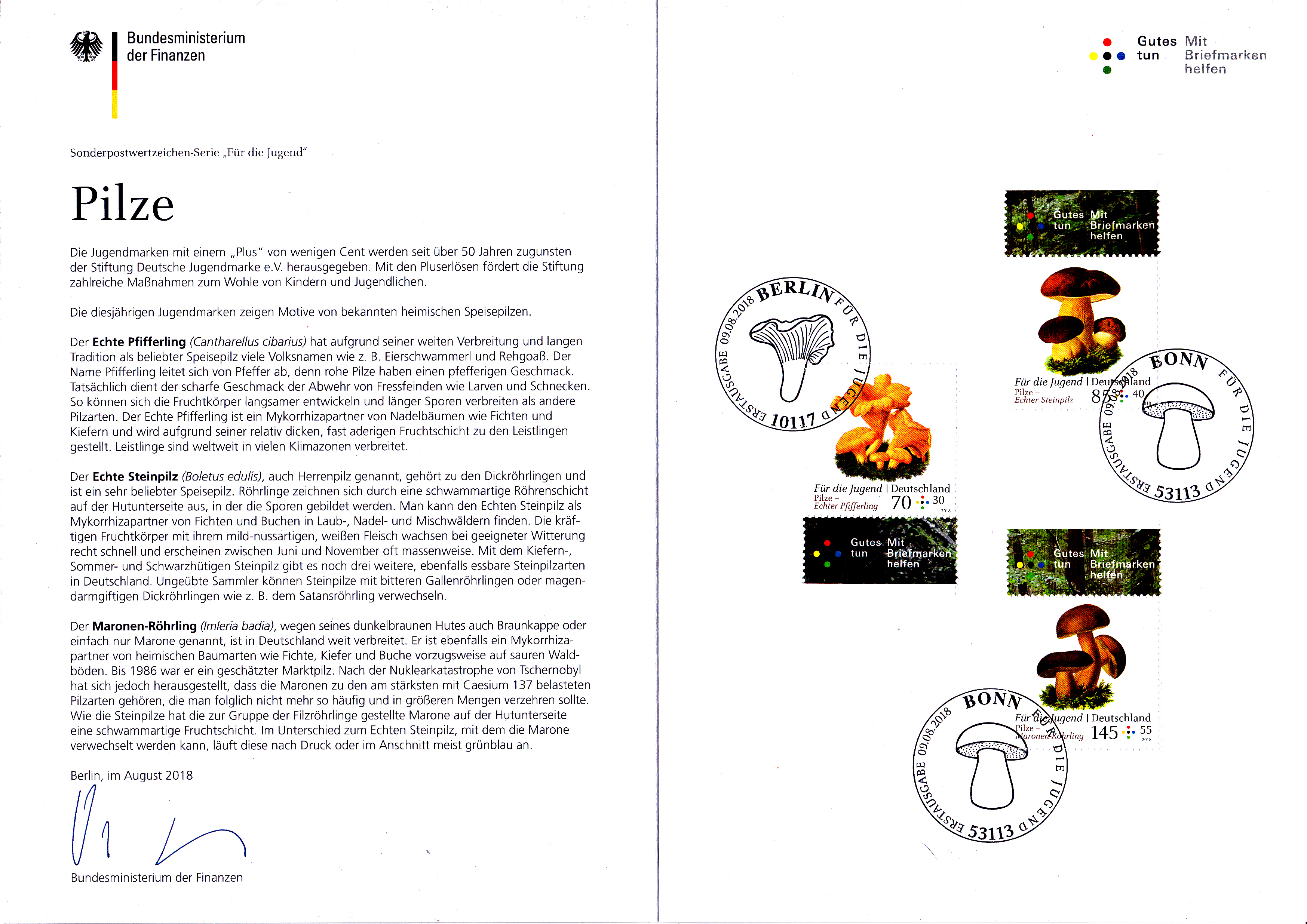 Ergänzend zu früheren Beiträgen zeige ich heute die farbige Ministerkarte des Finanzministers mit den drei Marken für die Jugend 2018 mit den Pilzmotiven und den beiden Ersttagsonderstempel Bonn und Berlin.
