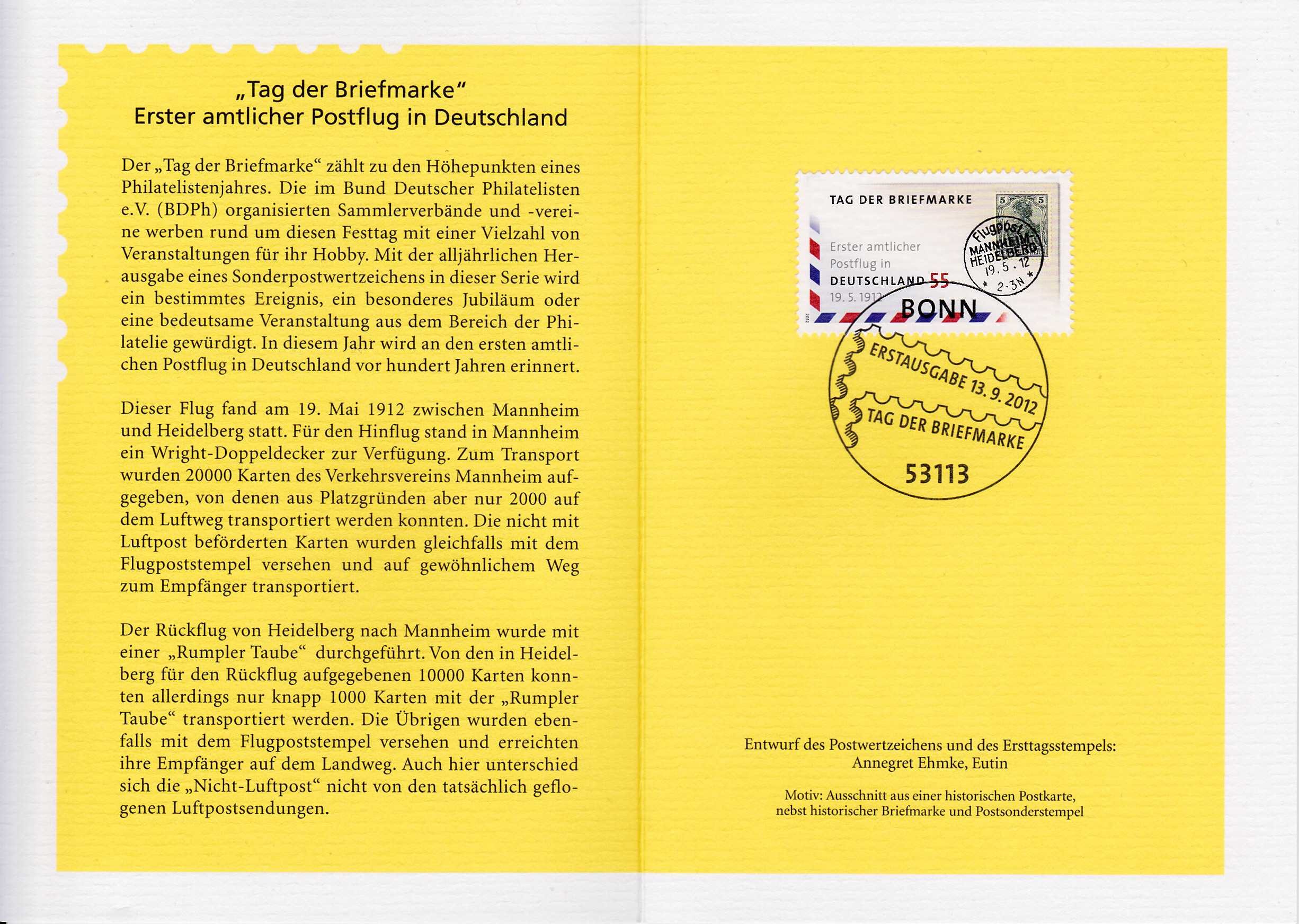 Klappkarte des Vorstandsvorsitzenden der Deutschen Post AG mit der Marke zum Tag der Briefmarke 2012 (MiNr 2954) und dem Ersttagsonderstempel Bonn.