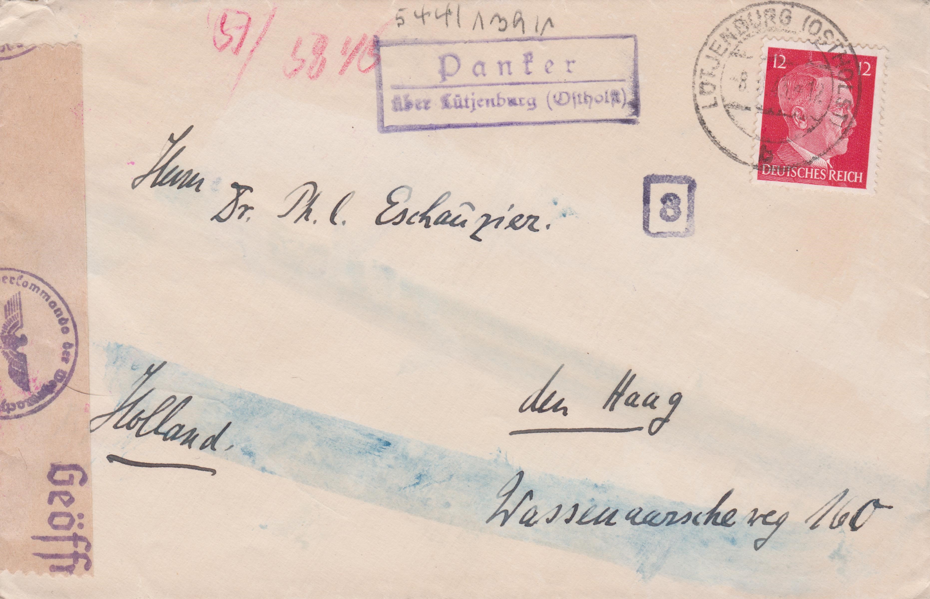 Dieser portogerecht mit 12 Pf frankierte, in "Panker über Lütjenburg (Ostholst)" aufgegebene, nach "den Haag Holland" adressierte Brief wurde der ABP Köln zugeleitet, wo er linksseitig geöffnet und vorderseitig sowie rückseitig mit jeweils drei verschiedenen Chemikalien chemisch zensiert wurde: