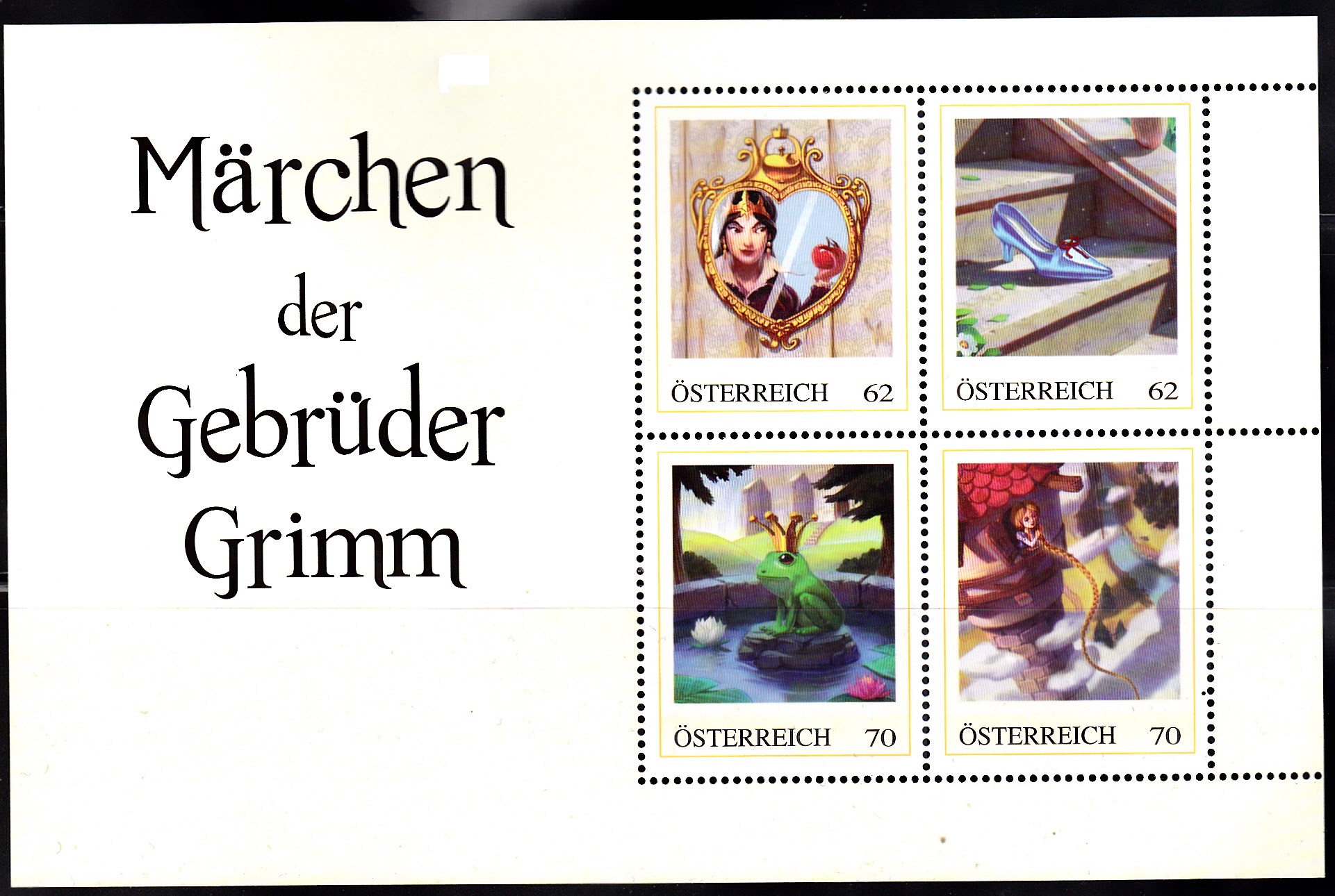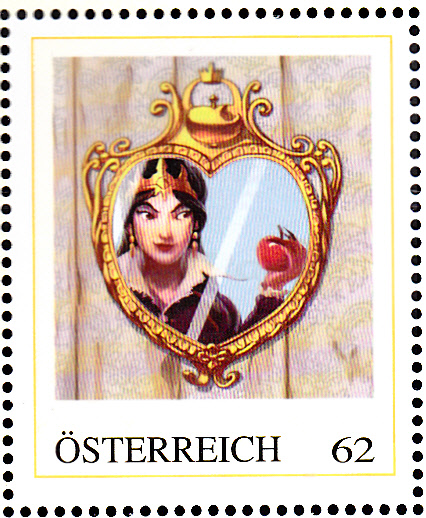 Diese Marke aus Österreich gehört zwar zu den "Marken auf Privatbestellung" wurde aber von der Post selbst in einem Buch mit dem Titel "Ausgewählte Märchen der Gebrüder Grimm" verkauft. Die Marke zeigt die Königin vor ihrem Spiegel.