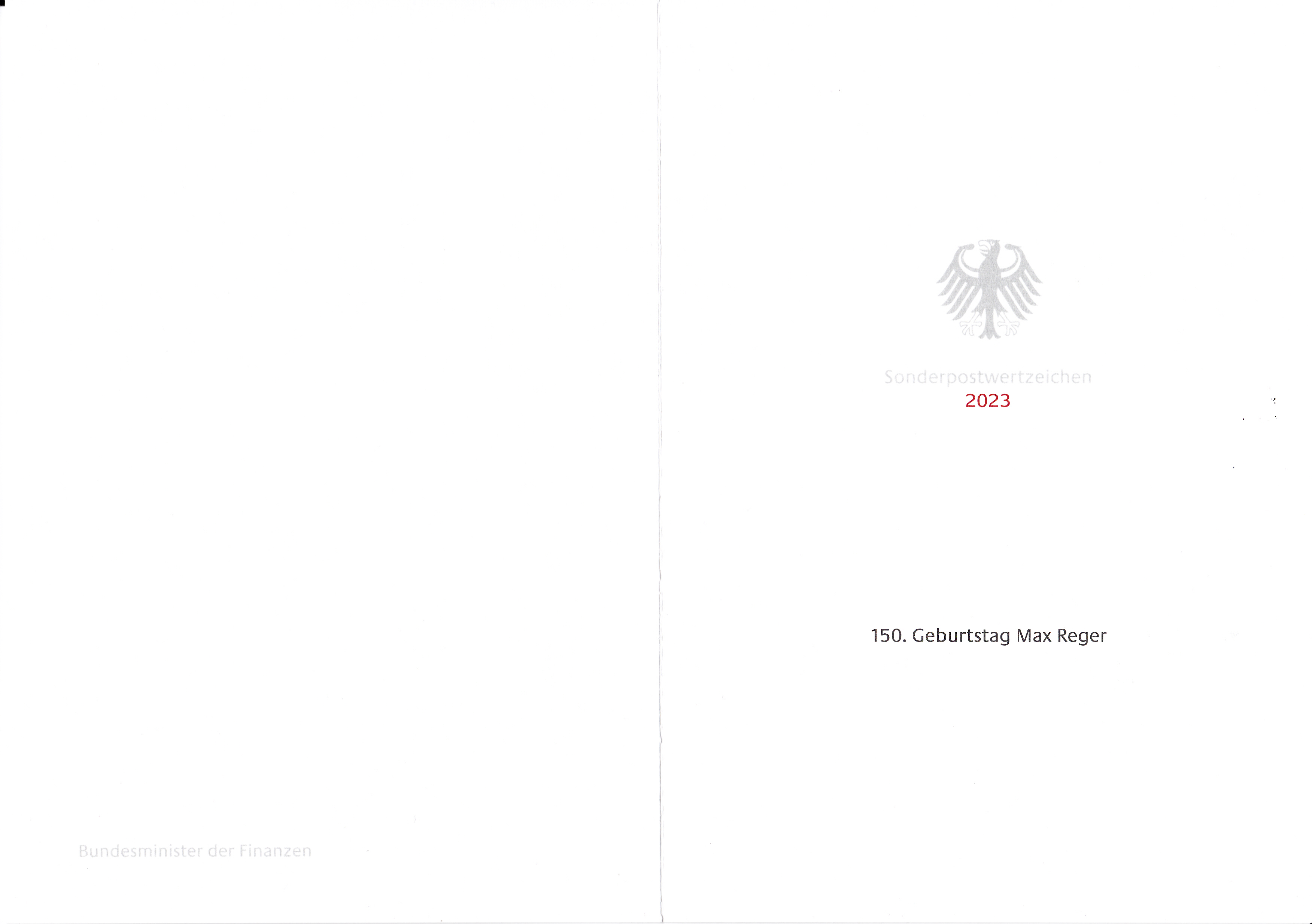 Ministerkarte des Bundesministers für Finanzen mit zwei Marken (MiNr 3753) zum 150. Geburtstag von Max Reger und den beiden Ersttagsonderstempel Bonn und Berlin.