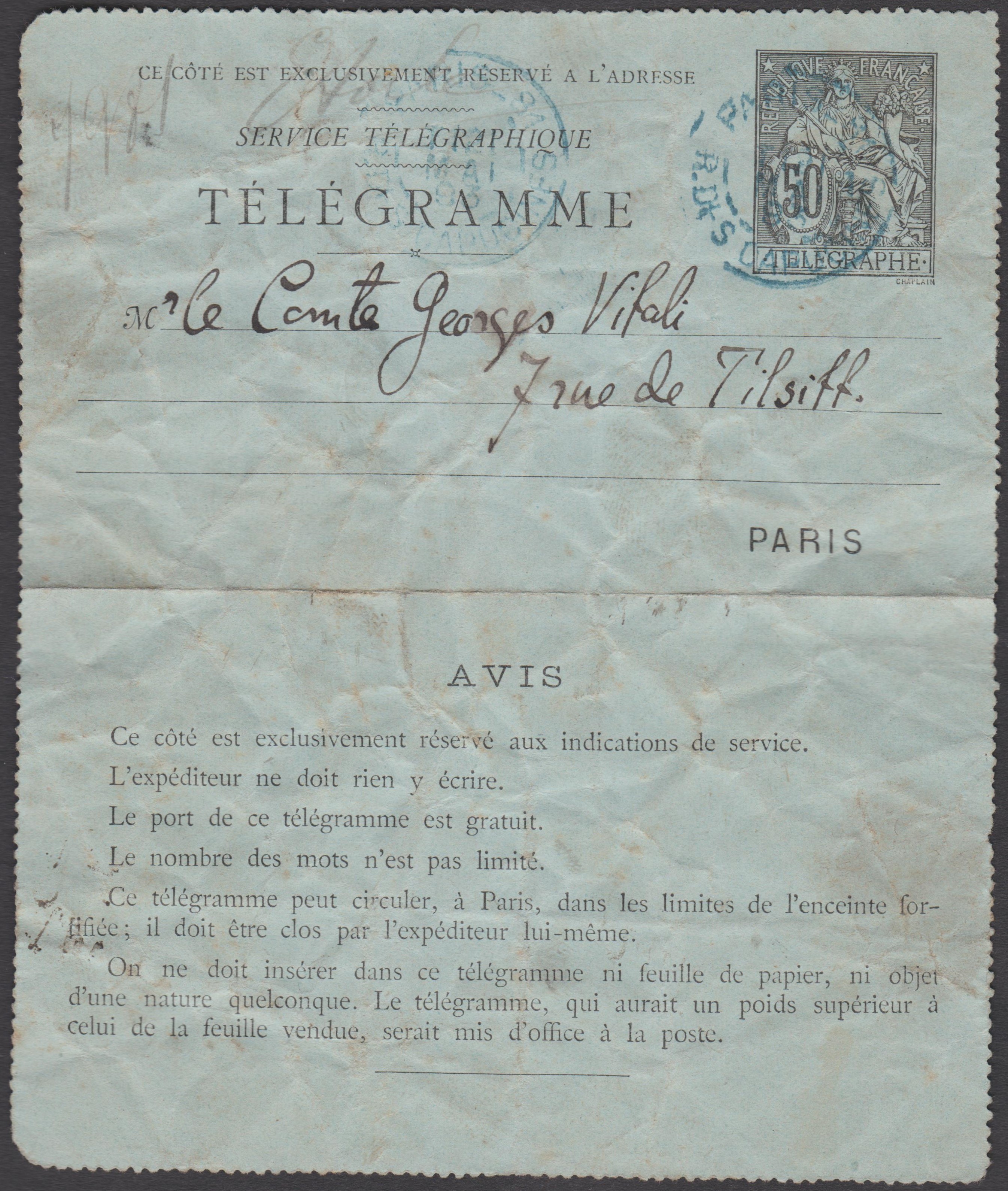 Rohrpost-Kartenbrief (= CARTE PNEUMATIQUE) der französischen Post zur Beförderung per Rohrpost in Paris: