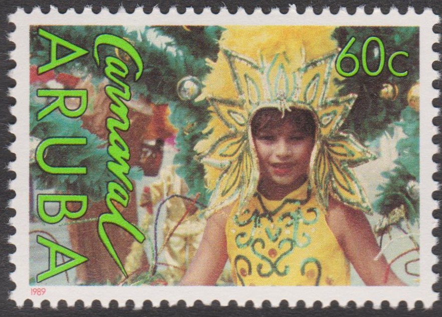 Aruba MiNr. 55 erschien am 05.01.1989 zum Thema "Karneval", Wertstufe 60 C und zeigt das Motiv "Kostümiertes Mädchen":