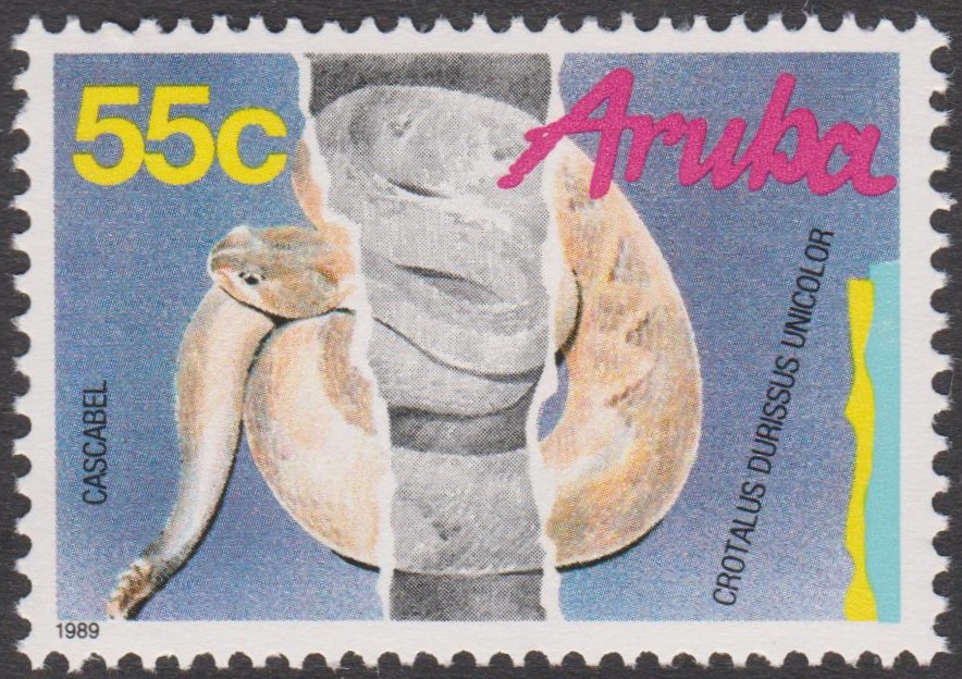 Aruba MiNr. 62 erschien am 24.08.1989 zum Thema "Klapperschlangen" und zeigt eine Tropische Klapperschlange (Crotalus durissus unicolor):