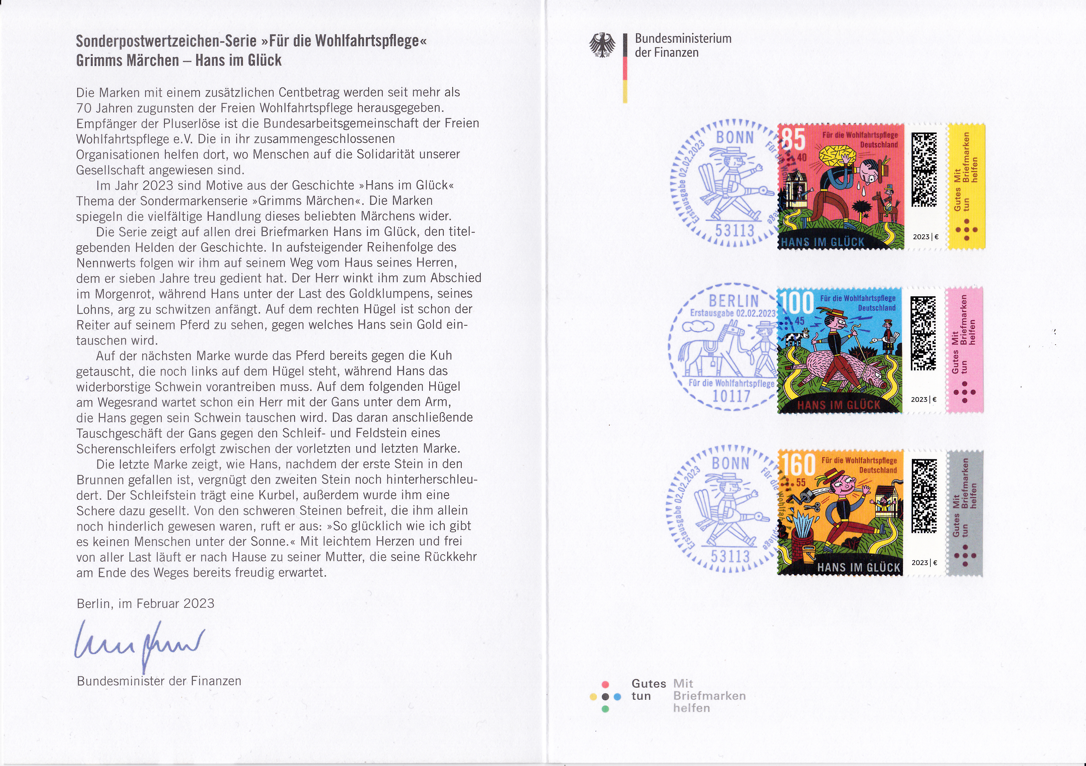 Ministerkarte des Bundesministers für Finanzen mit je einer Marke der Serie "Sehenswürdigkeiten in Deutschland" (MiNr 3738 und 3739) mit den Motiven "Blumeninsel Mainau im Bodensee" und "Förderturm der Zeche Zollverein" und den beiden Ersttagsonderstempel Bonn und Berlin.