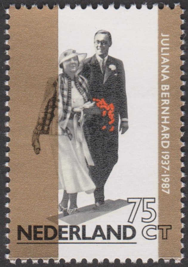 Anlass für diese Sondermarke war die Goldene Hochzeit von Juliana und Bernhard. Das Postwertzeichen zeigt die Beiden als Brautpaar.