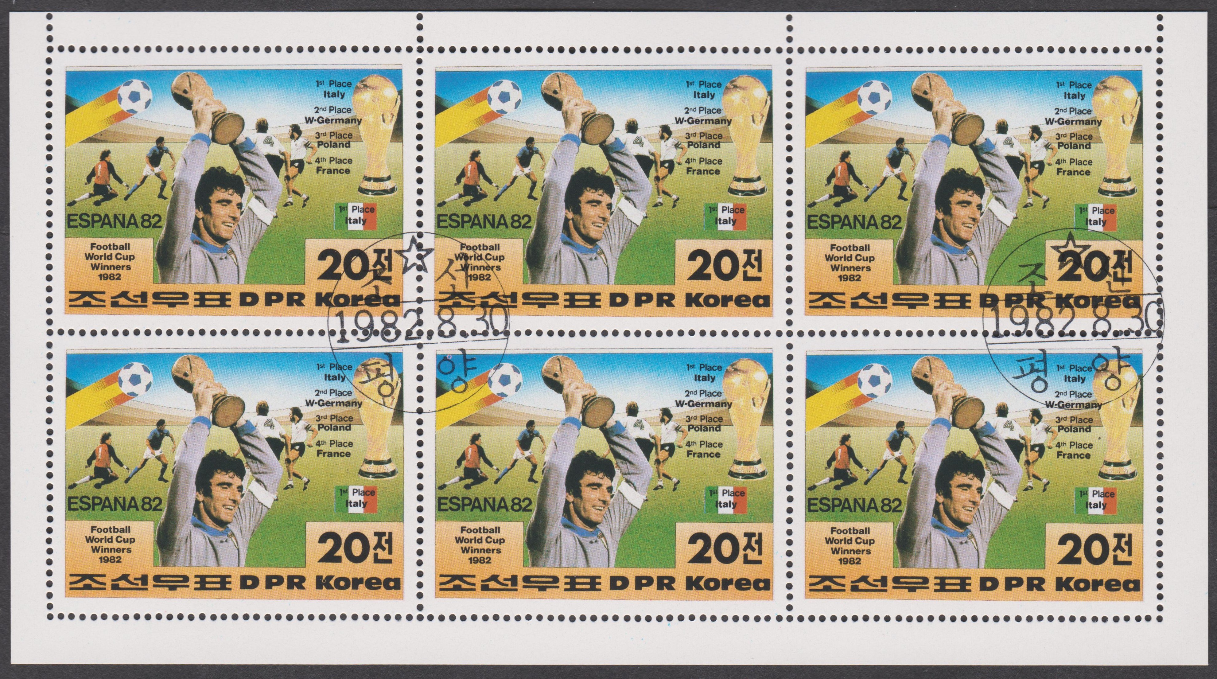 Nordkorea MiNr. 2269 erschien am 30.08.1982 zum Thema Gewinner der Fußballweltmeisterschaft 1982 und zeigt das Motiv "Fußballspieler vor Spielszene", hier als Sechserbogen: