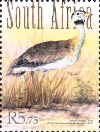Auf einer Marke aus Südafrika (MiNr 1969) wird eine Weißbauchtrappe oder Senegaltrappe (Eupodotis senegalensis) gezeigt.
