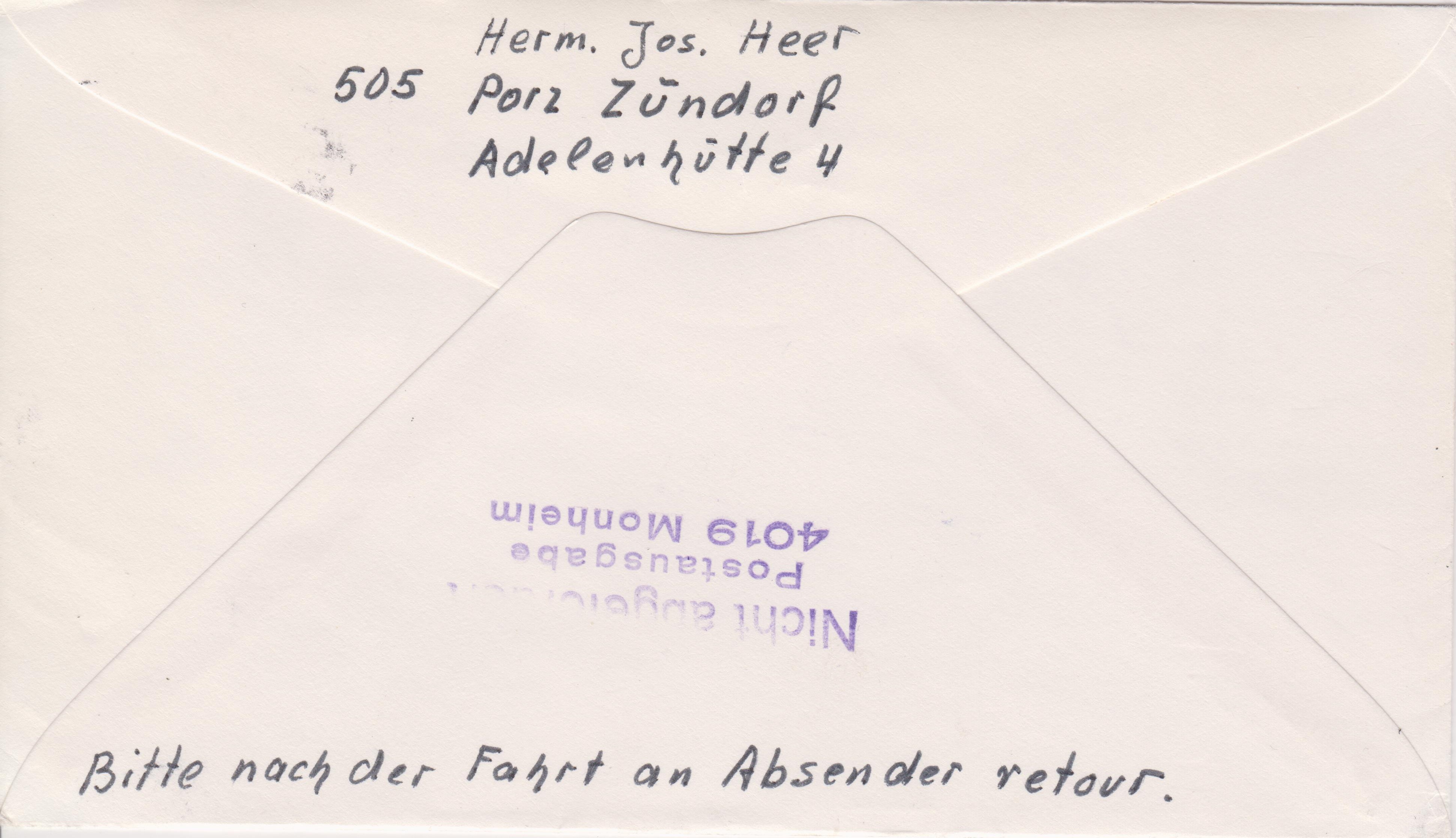 Laut rückseitig abgeschlagenem dreizeiligen Stempel wurde der Beleg "Nicht abgefordert Postausgabe 4019 Monheim" und ging daher an den Absender "Zurück":