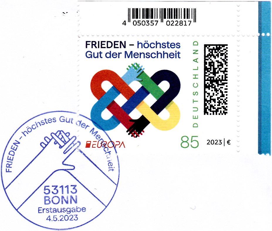 Die Europamarke 2023 ist bei der Deutschen Post am 4. Mai 2023 zum Thema "Frieden" erschienen. Die Marke zu 85 Cent zeigt das Gemeinschaftsmotiv "Verschlungene Bänder mit ineinanderfassenden Händen".