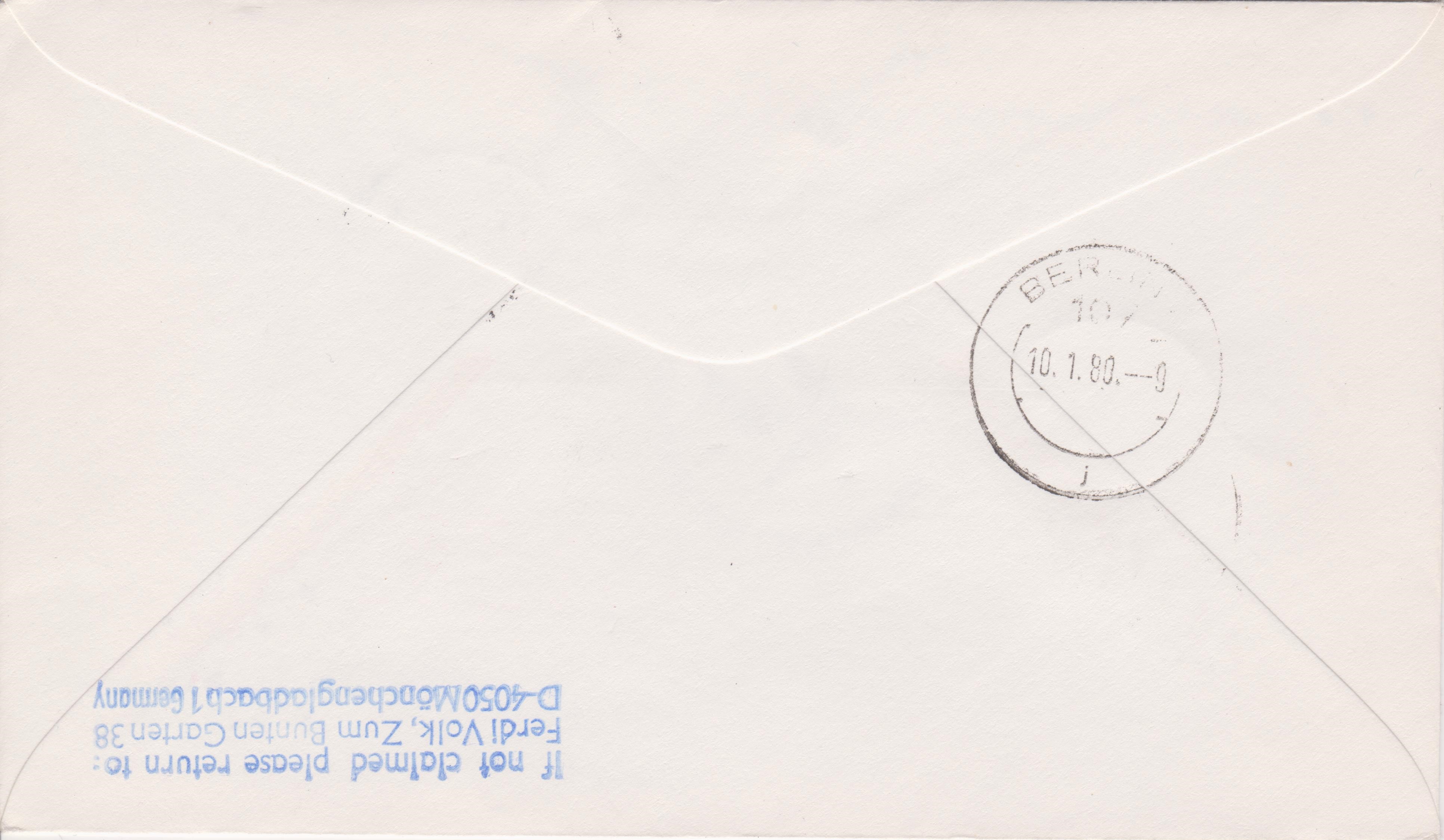 Luftpostbrief, frankiert mit Zypern MiNr. 503 sowie der obligatorischen Zwangszuschlagsmarke Zypern MiiNr. 3, aufgegeben am 31.12.1979 in LARNACA, befördert auf dem Flug "INTERFLUG IL 62" nach Berlin Flughafen Tegel, wo der Empfänger diese postlagernde Sendung dann abholte: