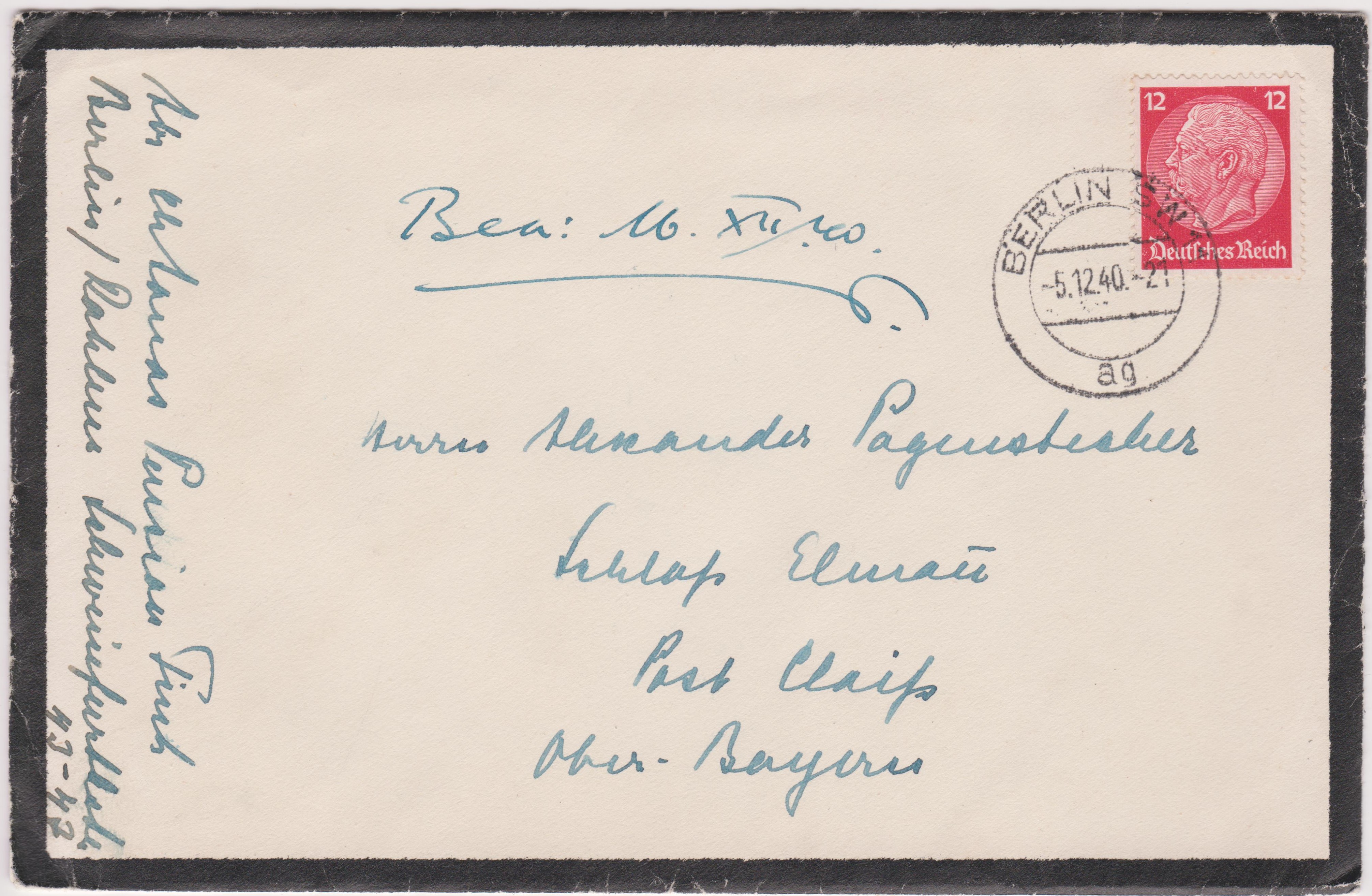 Trauerbrief, Portostufe 12 Pf, aufgegeben am 05.12.1940 in BERLIN S W 11 dargestellt als Einzelfrankatur der Dauerserie Hindenburg Medallion: