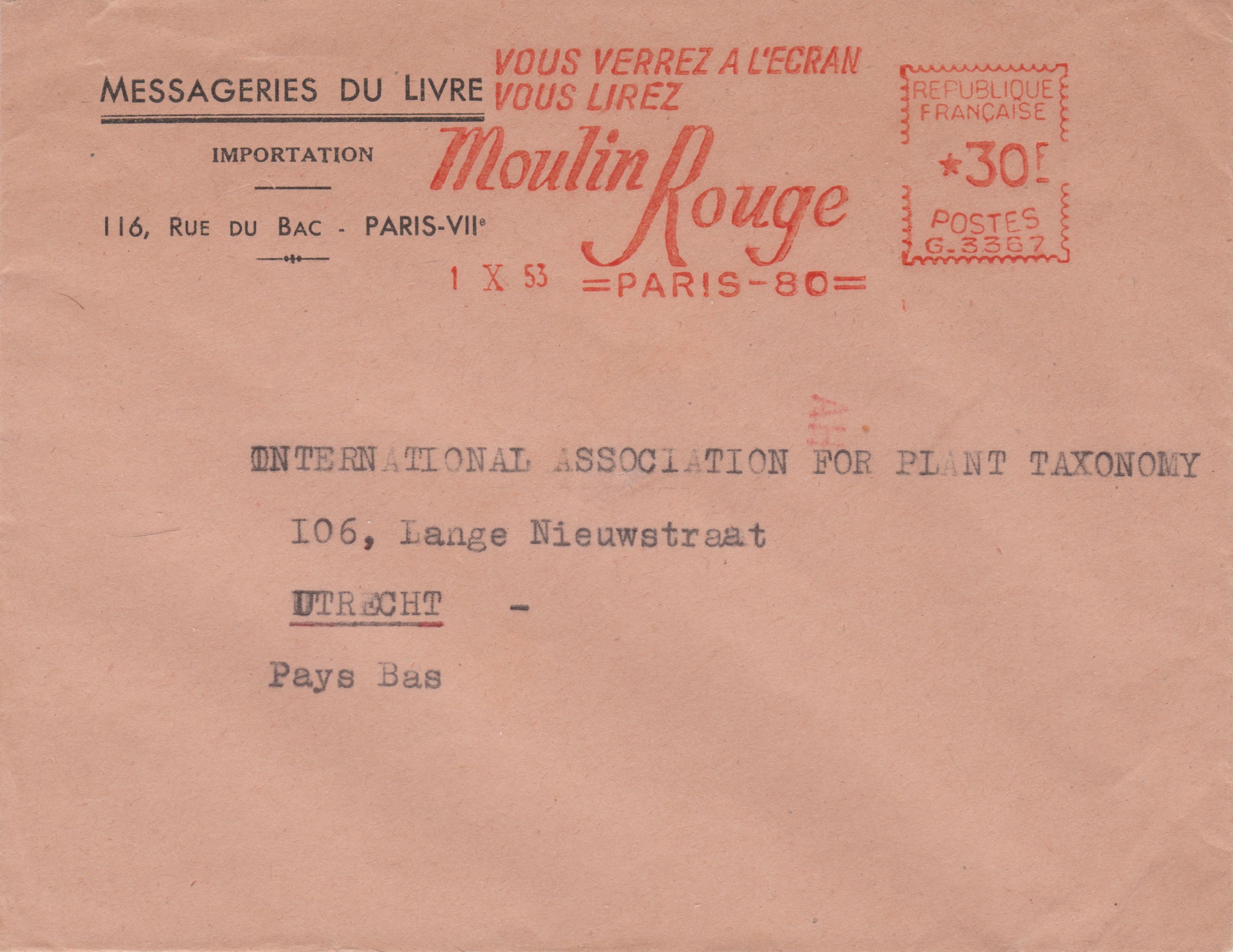 Dieser am 01.10.1953 in PARIS in Frankreich aufgegebene, nach Utrecht adressierte Beleg erhielt in Utrecht eine Eingangscodierung "AH" per Transorma: