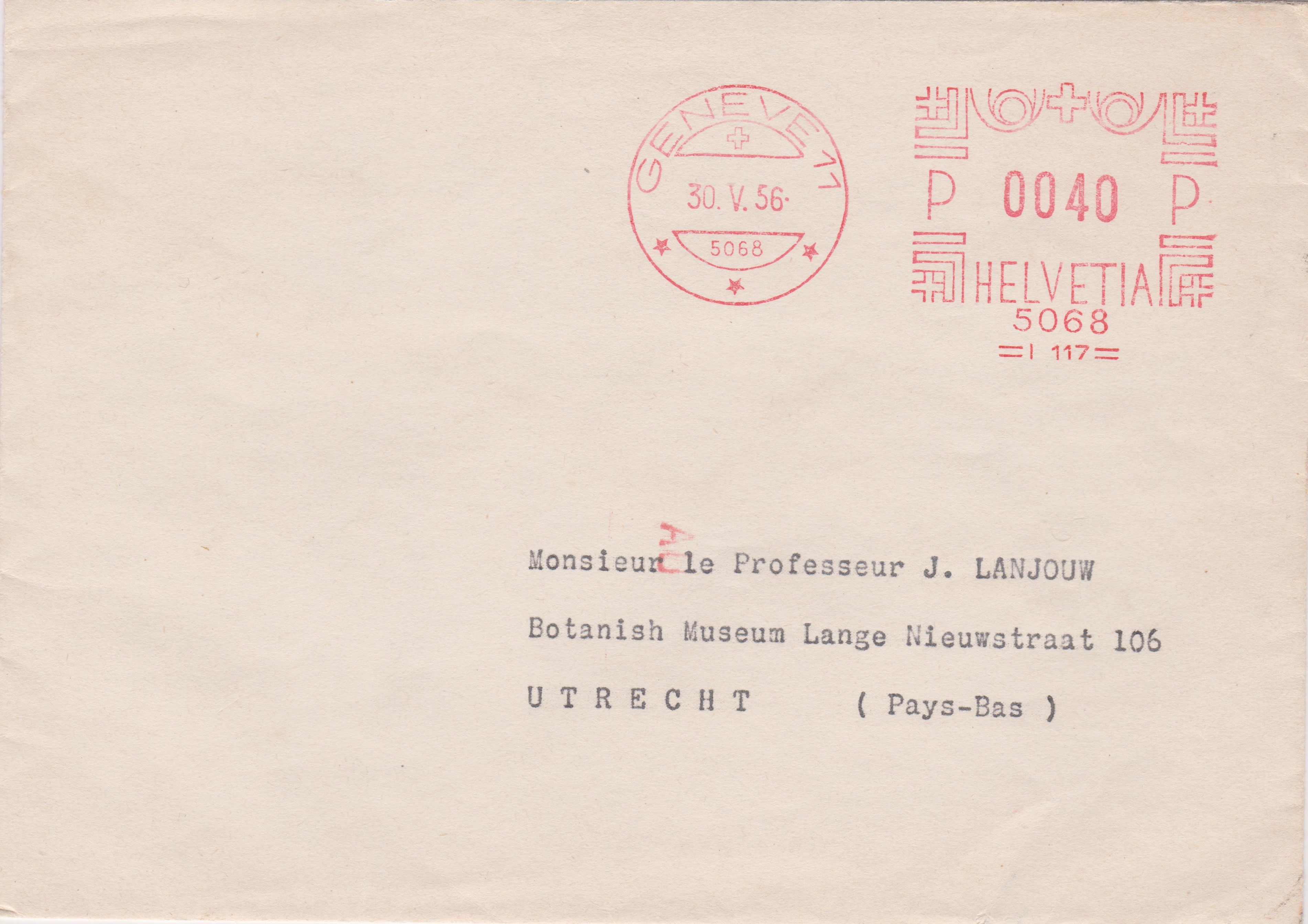 Dieser am 30.05.1956 in GENEVE (= Genf in der Schweiz) aufgegebene Beleg nach UTRECHT erhielt in Utrecht eine Eingangscodierung "AU" per Transorma: