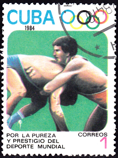 Eine Marke aus Kuba (MiNr 2720) zu den Olympischen Spielen 1984 zeigt eine Szene beim Ringen.