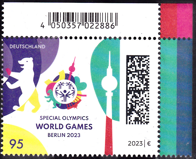 Zu den Special Olympics World Games Berlin 2023 erschien bei der Deutschen Post eine Marke (MiNr 3770) mit dem Emblem der Spiele, dem Berliner Bär und dem Funkturm. Hier zeige ich eine Marke vom Eckrand mit EAN-Codierung.