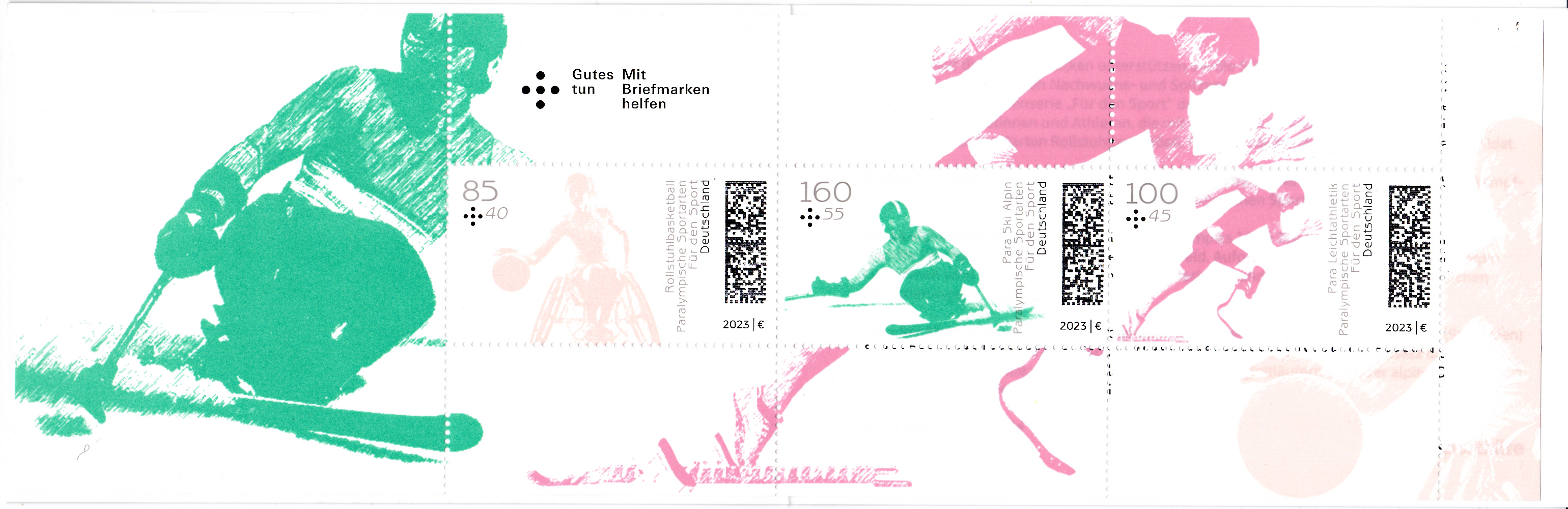 Die Marken für die Sporthilfe 2023 mit Paralympischen Sportarten (MiNr 3762 bis 3764) sind auch in einem Markenheftchen erschienen.