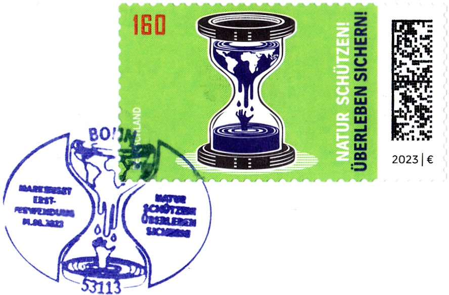 Zum Thema "Umweltschutz: Überleben sichern" erschien bei der Deutschen Post diese Marke (MiNr 3771) mit der Abbildung einer Sanduhr mit schmelzender Welt und der Hand eines Ertrinkenden.