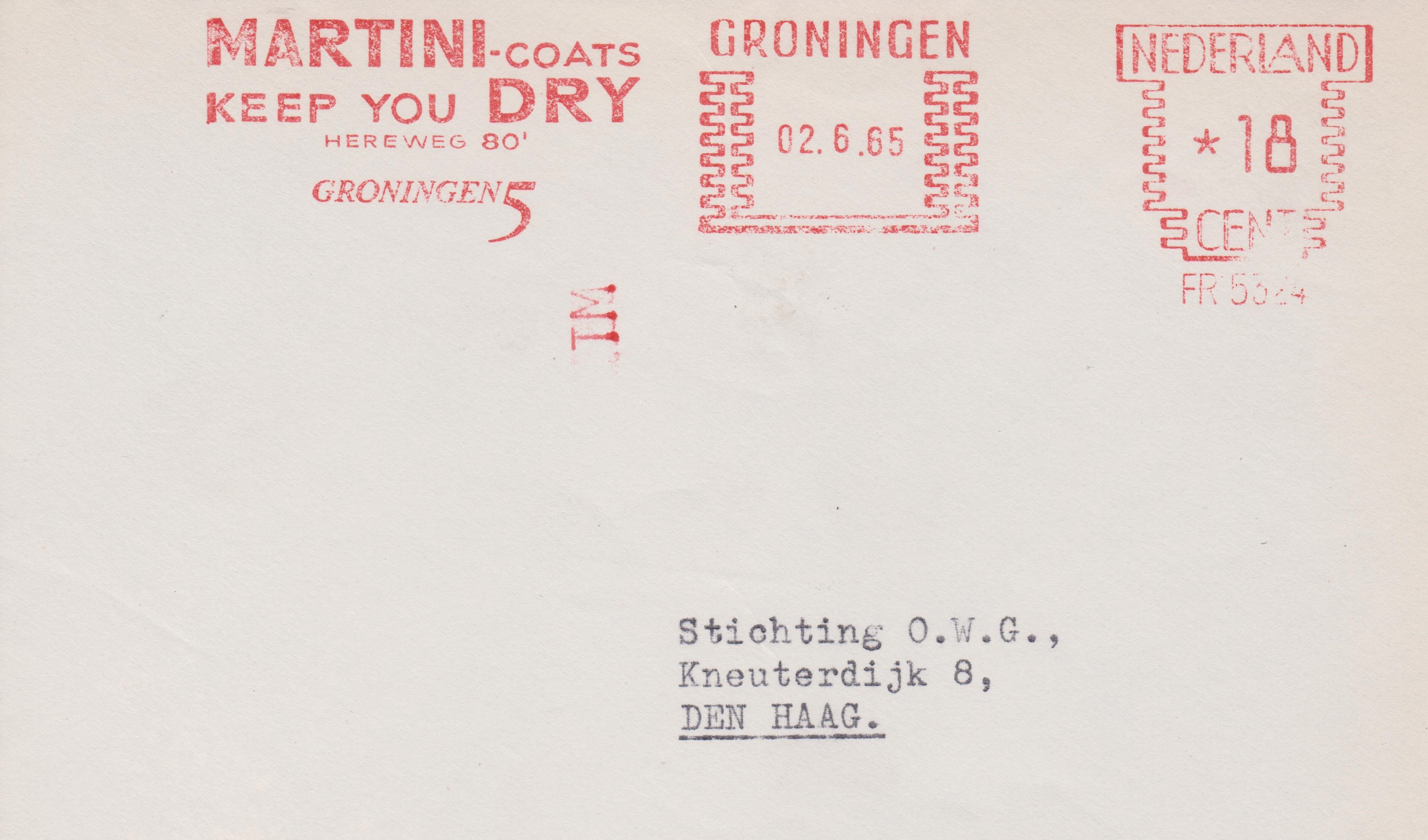 Ausschnitt aus einem Brief nach Den Haag mit einem Absenderfreistempel vom 02.06.1965 aus GRONINGEN: