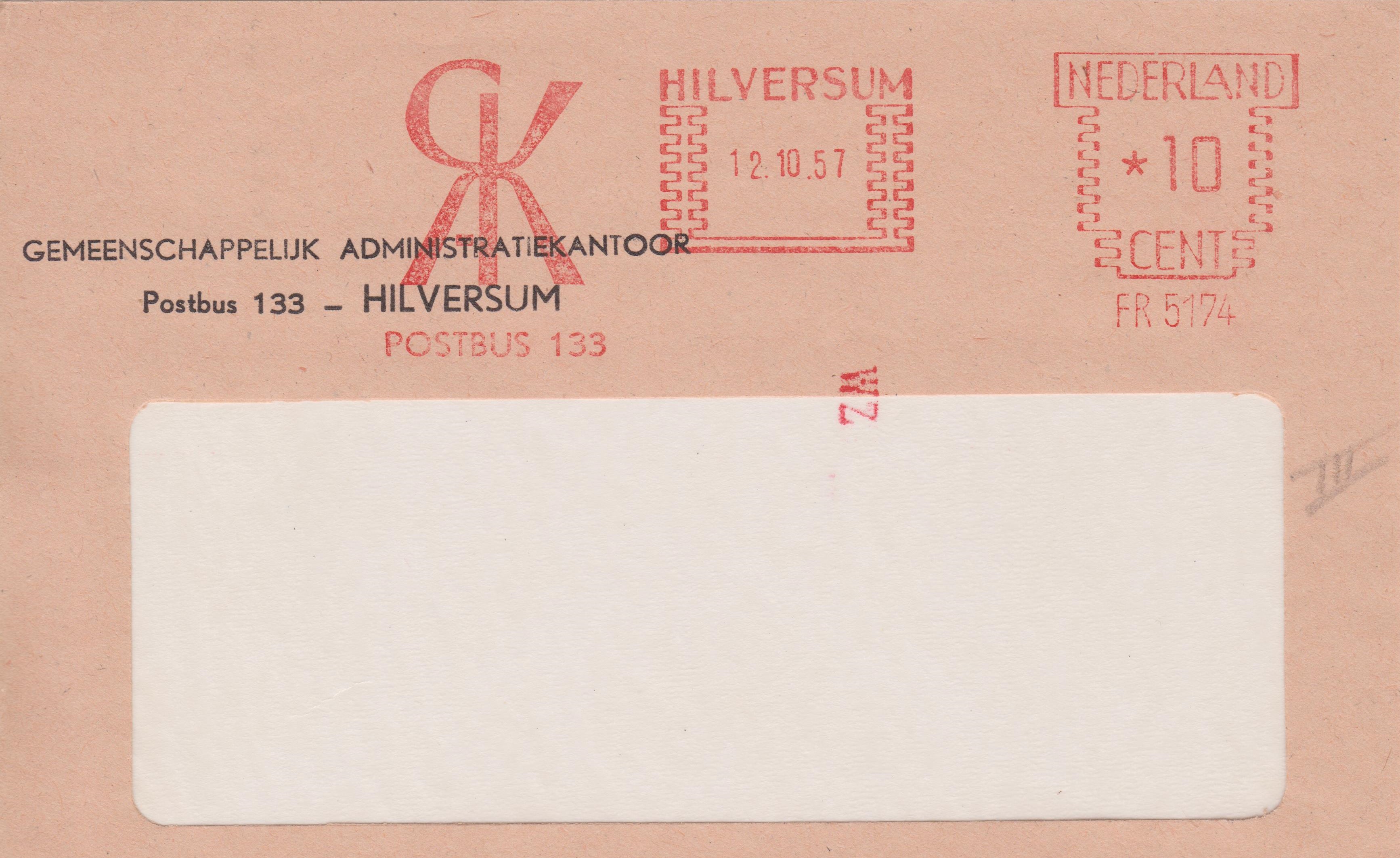Ausschnitt aus einem Fensterbrief mit einem Absenderfreistempel vom 12.10.1957 aus HILVERSUM: