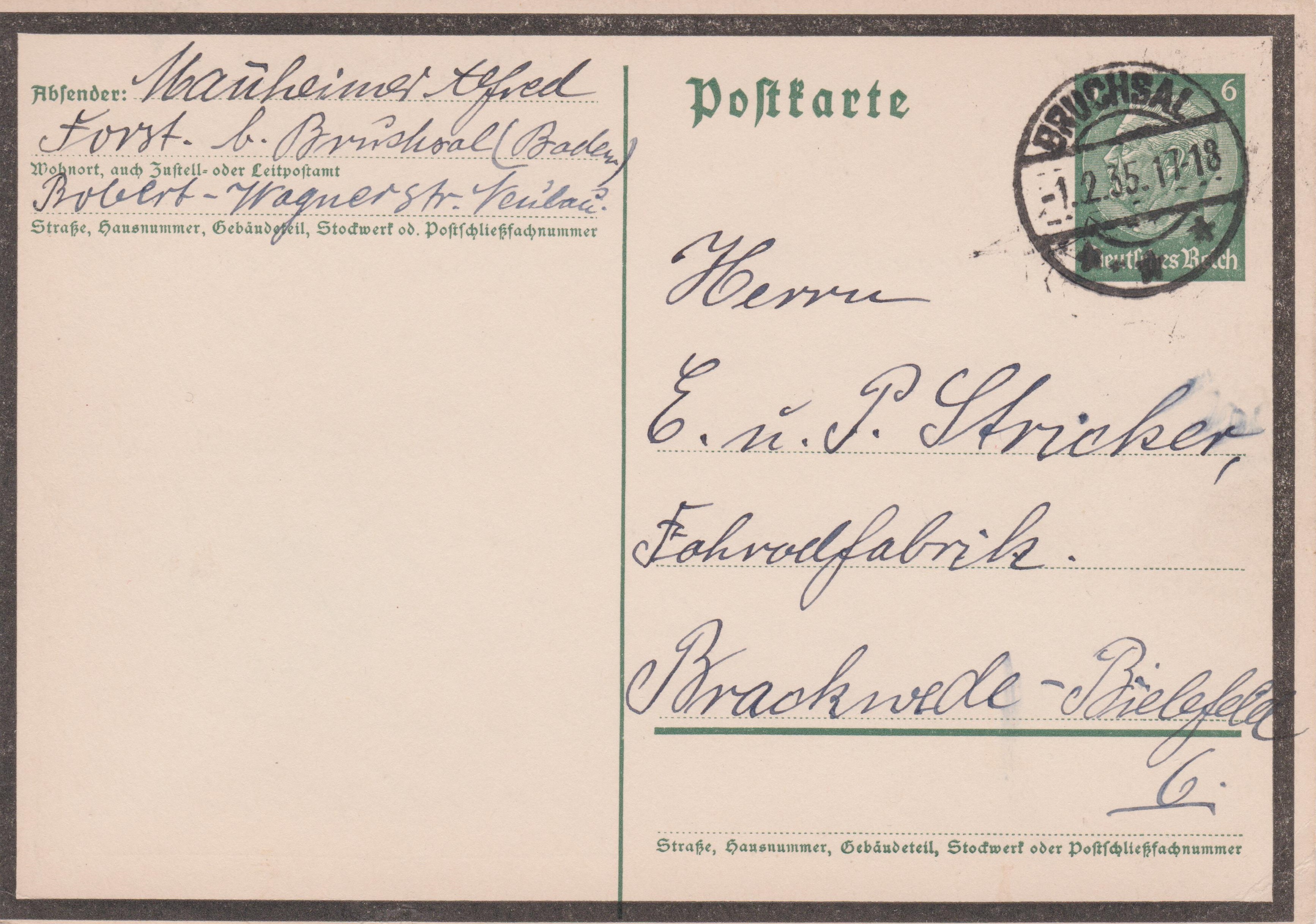 Das Porto für einen Brief im Frnverkehr in Höhe von 12 Pfennig wurde bei der Einlieferung im Postamt bar bezahlt, was ein zweizeiliger Stempel dokumentiert.