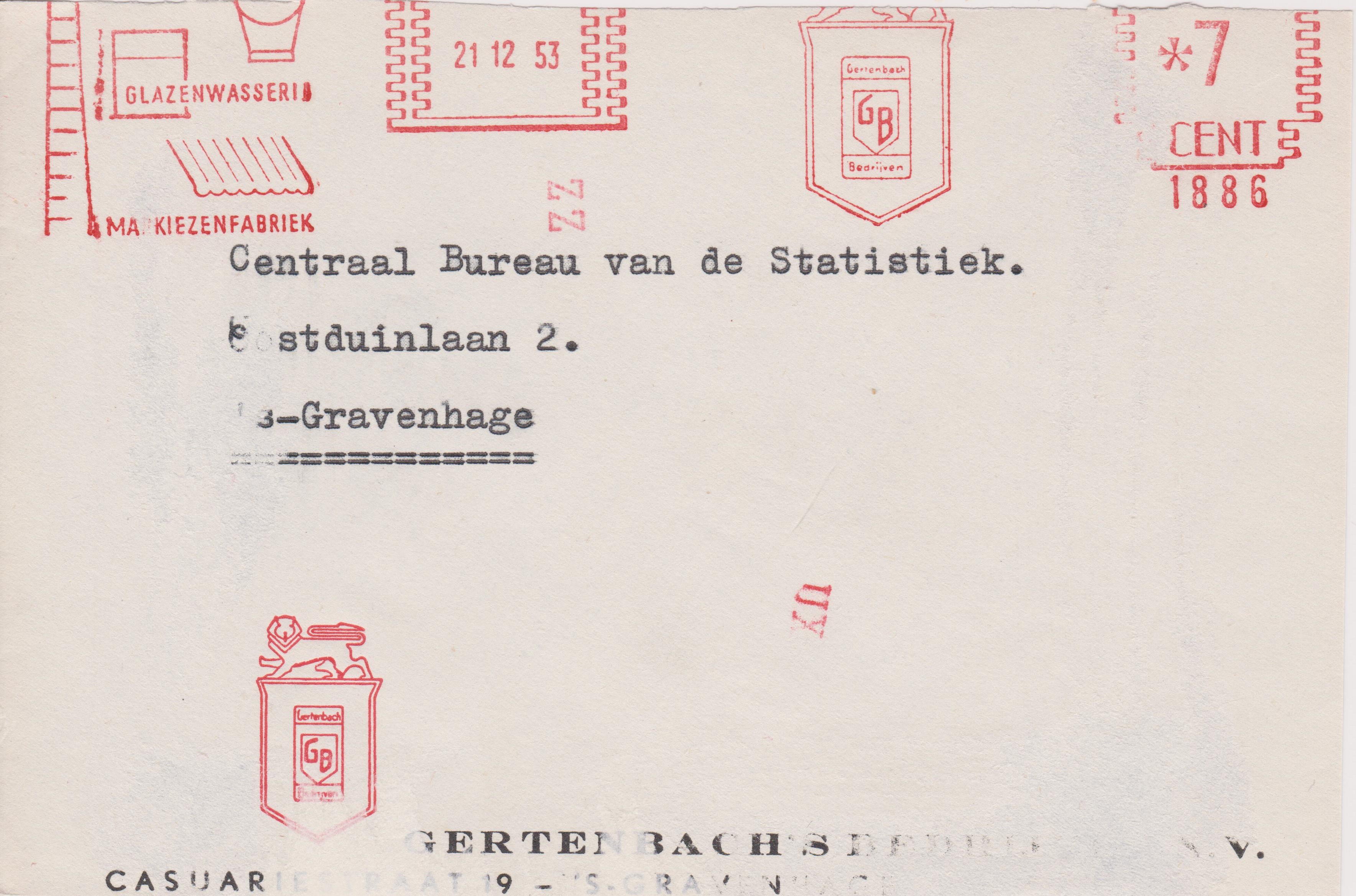 Ausschnitt aus einem Beleg mit einem Absenderfreistempel vom 21.12.1953, gelaufen nach DEN HAAG (= 's-Gravenhage):