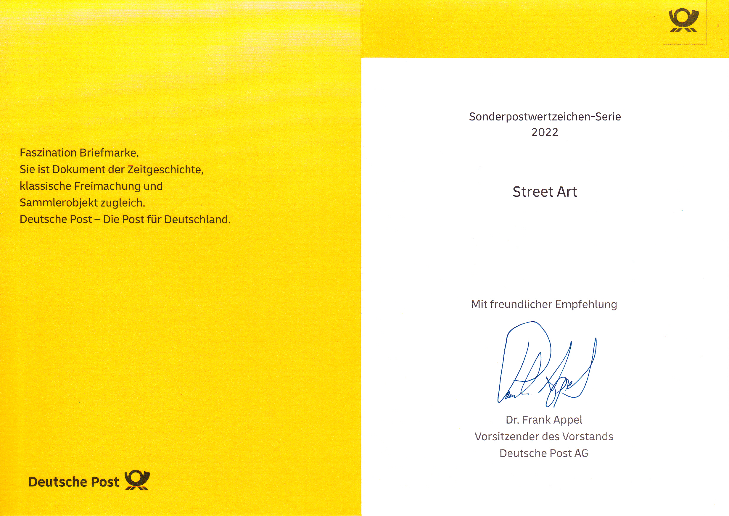 Klappkarte des Vorstandsvorsitzenden der Deutschen Post AG mit der Marke der Deutschen Post (MiNr 3667) aus der Serie "Street Art" mit dem Motiv "Wandmalerei „Pfau und Kranich“" von Christoph "Jeroo" Ganter (geb.1980, deutscher Graffiti-Künstler) und dem Ersttagsonderstempel Bonn.