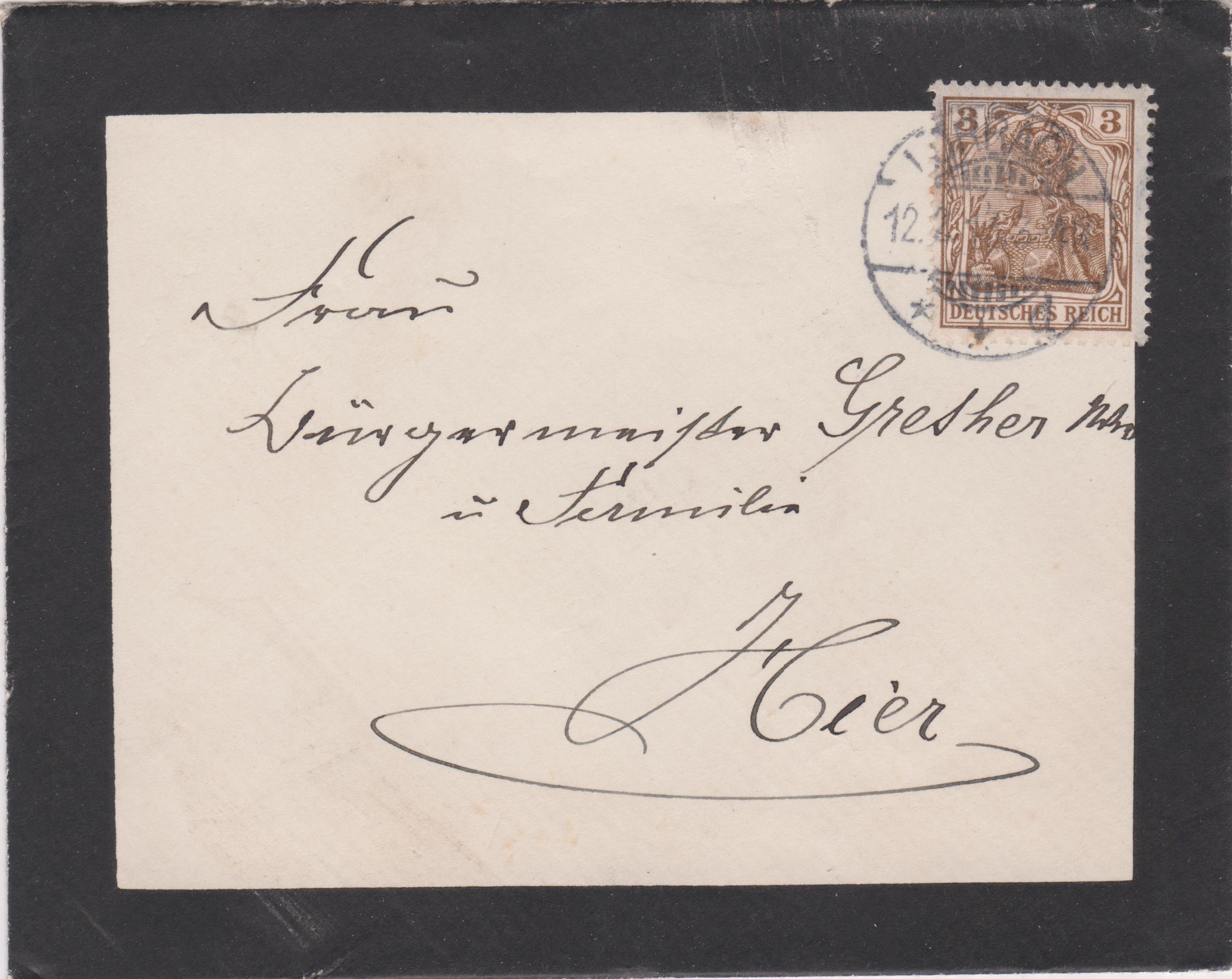 Das Porto für einen Brief im Frnverkehr in Höhe von 12 Pfennig wurde bei der Einlieferung im Postamt bar bezahlt, was ein zweizeiliger Stempel dokumentiert.