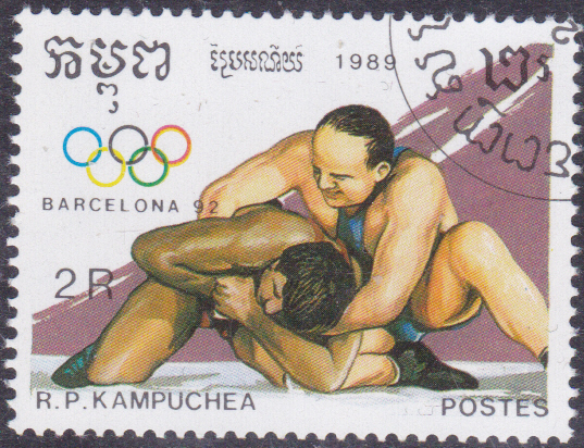 Aus einer Serie aus dem Jahre 1989 zu den Sommerspielen 1992 stammt diese Marke (MiNr 1040) aus Kambodscha mit einer Kampfszenen beim Ringen.