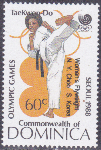 Beim Taekwondo der Frauen gewann im Fliegengewicht (bis 47 kg) Choo Nam-yul aus Süd-Korea die Goldmedaille, wie diese Marke mit Aufdruck aus Dominica (MiNr 1190, Urmarke MiNr 1082) belegt.