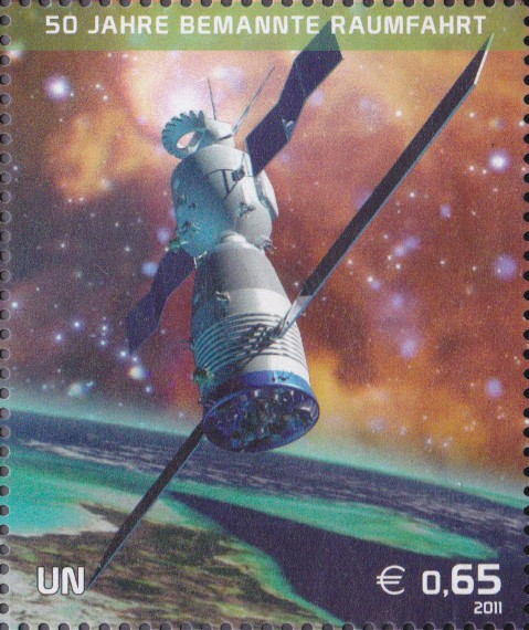 Zum Jubiläum "50 Jahre bemannte Weltraumfahrt" ist bei der Postverwaltung der UNO Wien diese Marke (MiNr 716) mit einer Abbildung einem Sowjetischen Raumschiff Sojus erschienen.