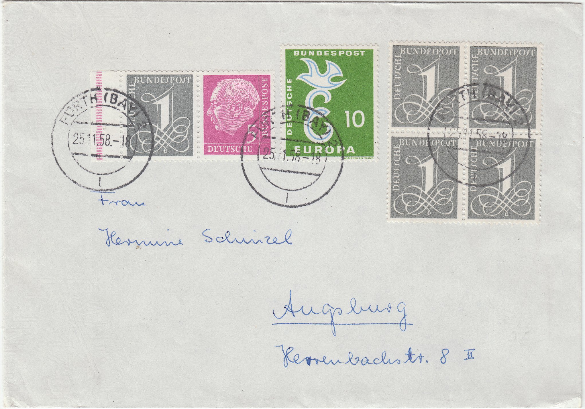 Zusammendruck Heuss 2 Pf/10 Pf/8 Pf = MiNr. W 13, am 09.07.1958 portorichtig auf Fernbrief (20 Pf):