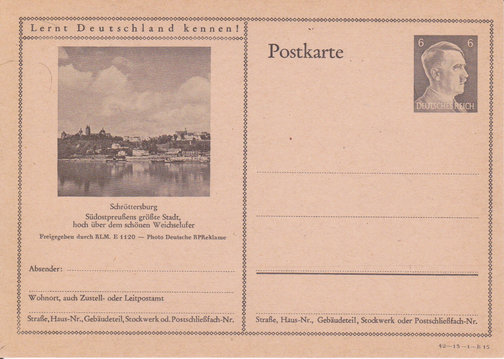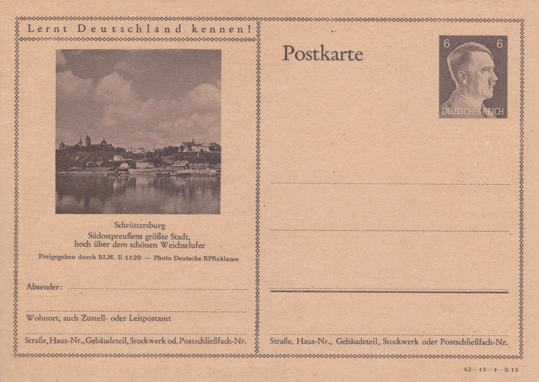 Schröttersburg (Name von 1941-1945) zeigt auf dieser Karte (Serie 13 Bild 13) eine Ansicht der Stadt vom Weichselufer). Schröttersburg heißt heute wieder Płock (wie vor1941) und ist eine Stadt in Polen in der Woiwodschaft Masowien etwa 100 km nordwestlich von Warschau an der Weichsel.