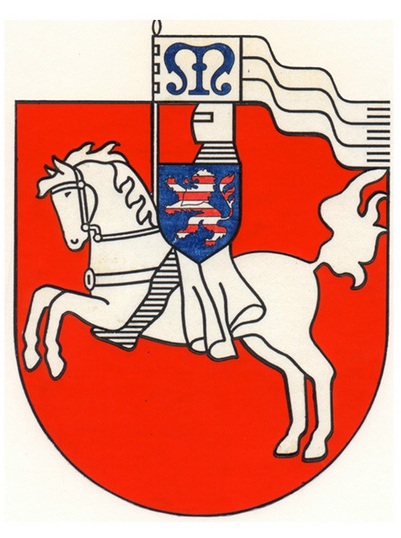 Auf einem Apfelschimmel sitzt der Landgraf beim heutigen Stadtsiegel mit einer auf den Sattelknopf gestützten kurzschäftigen Fahne: