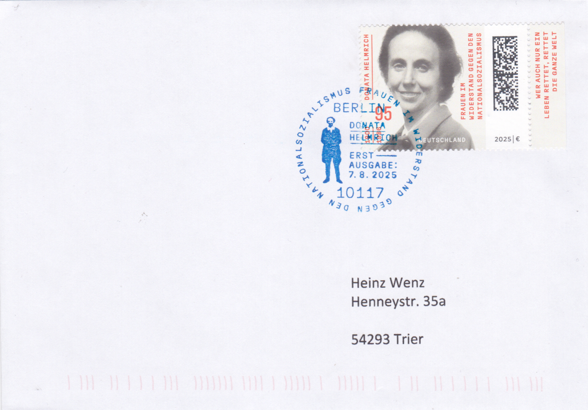 Ministerkarte des Bundesministers für Finanzen mit zwei Marken aus der Serie "Frauen im Widerstand gegen den Nationalsozialismus" (MiNr 3921) mit dem Motiv "Maria Annalise Donata Helmrich" und den beiden Ersttagsonderstempel Bonn und Berlin.