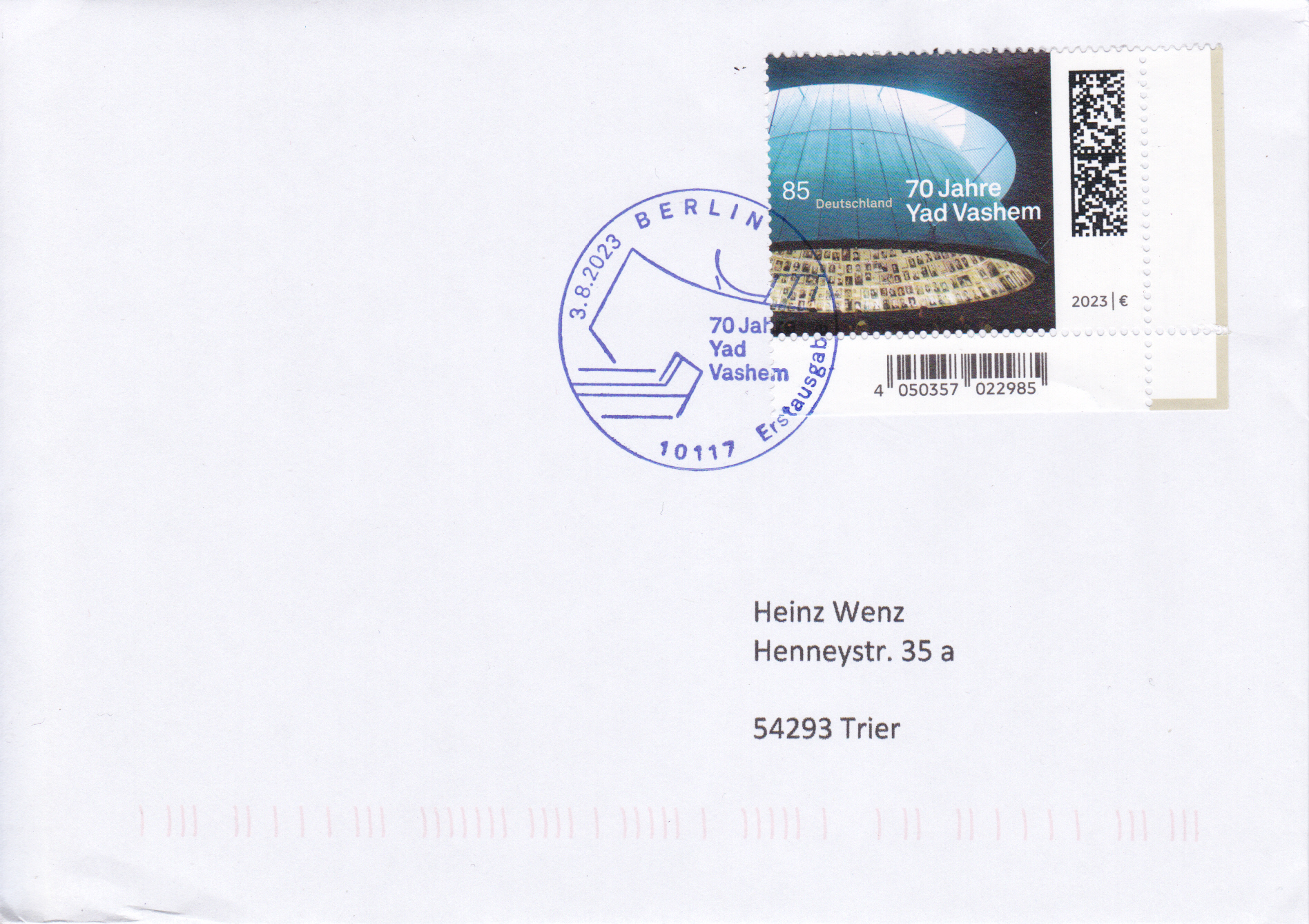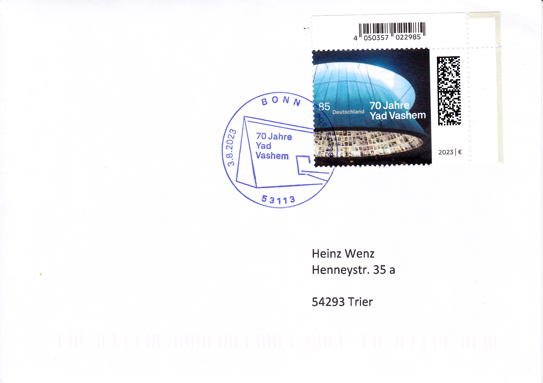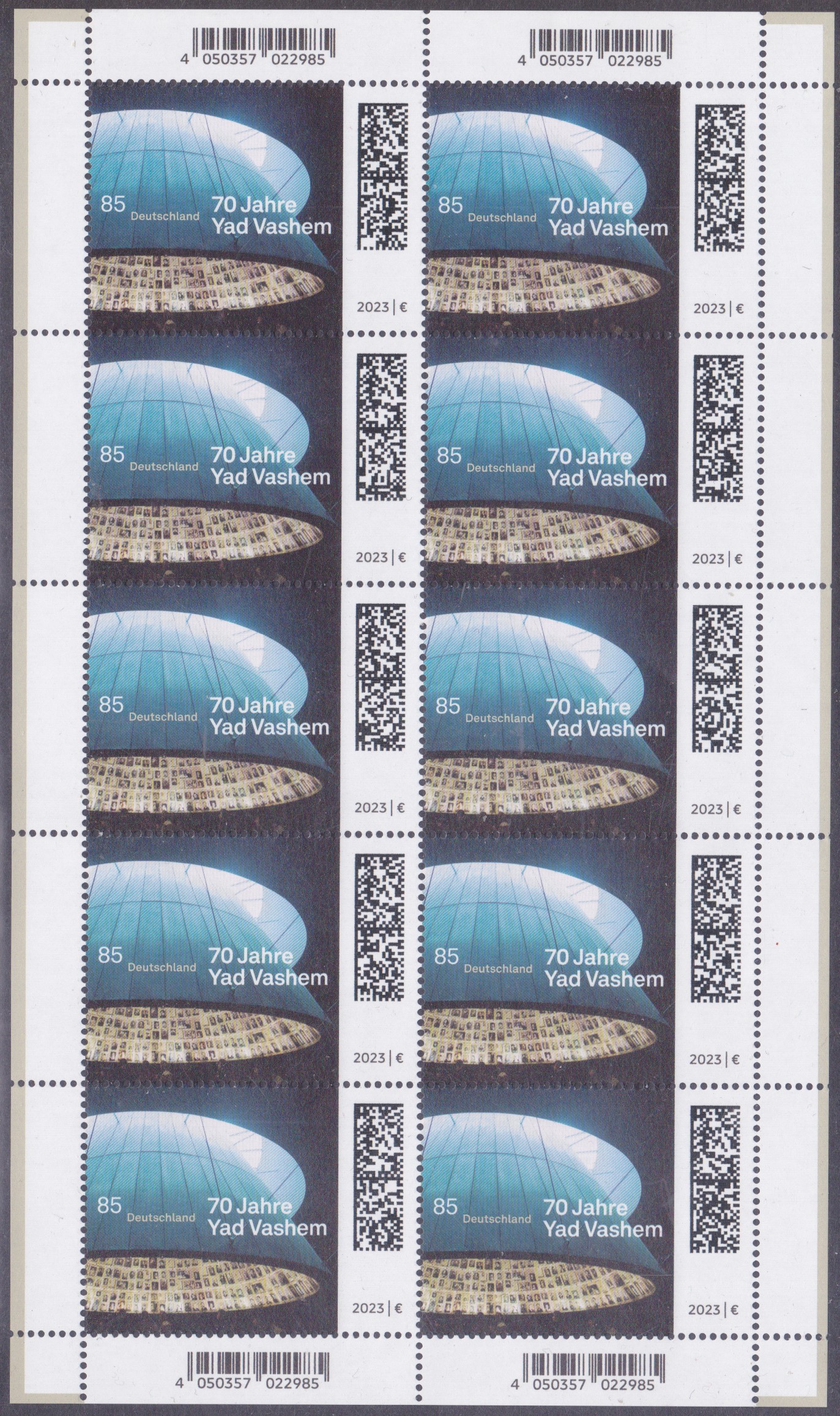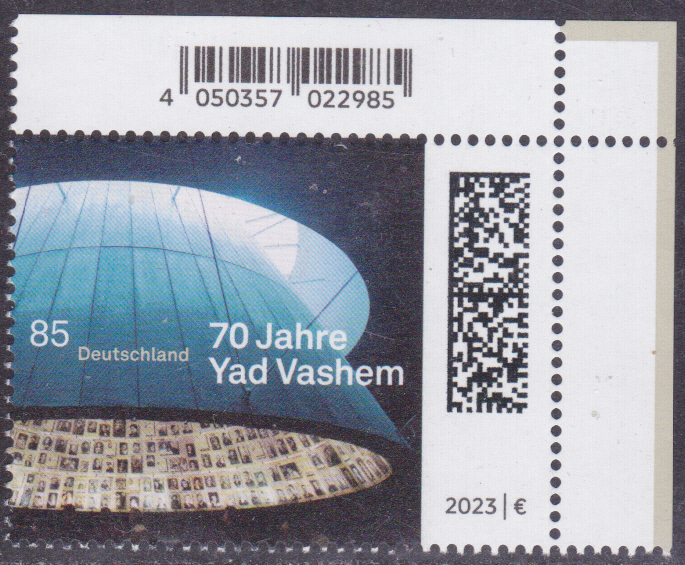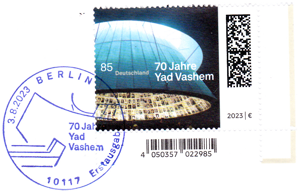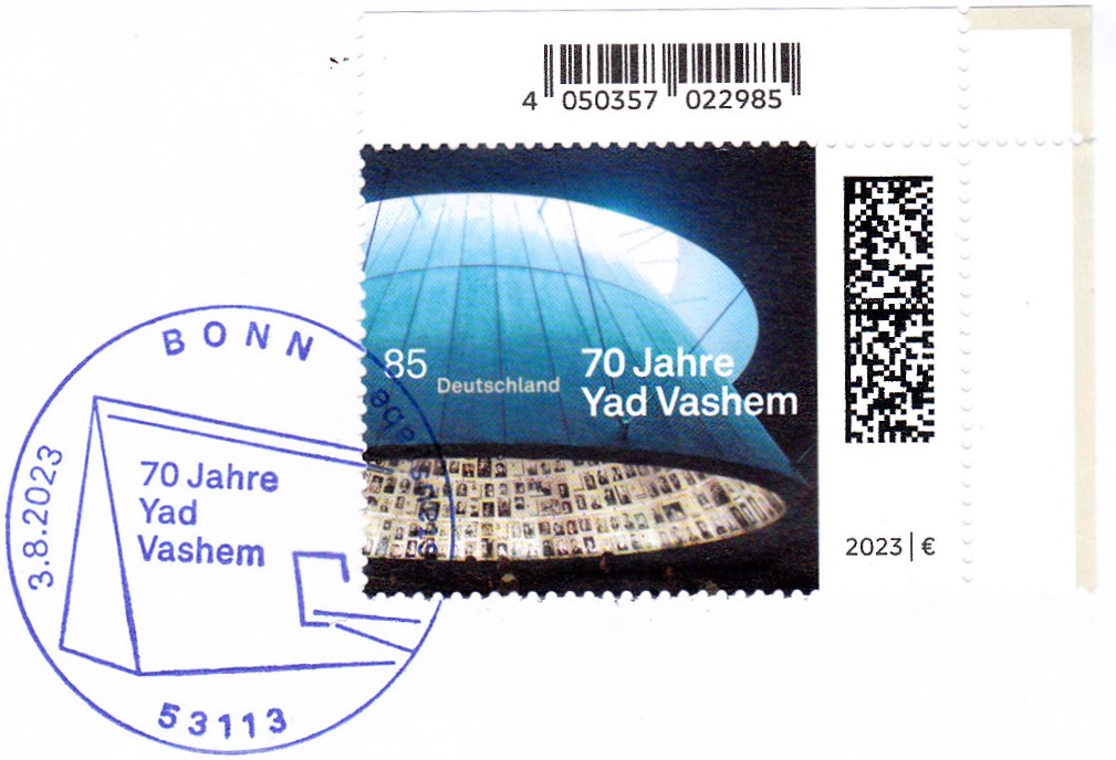 Zum Jubiläum "70 Jahre Yad Vashem" ist bei der Deutschen Post eine Marke (MiNr 3781) erschienen. Sie zeigt die "Halle der Namen", einen Teil der internationalen Holocaust-Gedenkstätte Yad Vashem, Jerusalem.