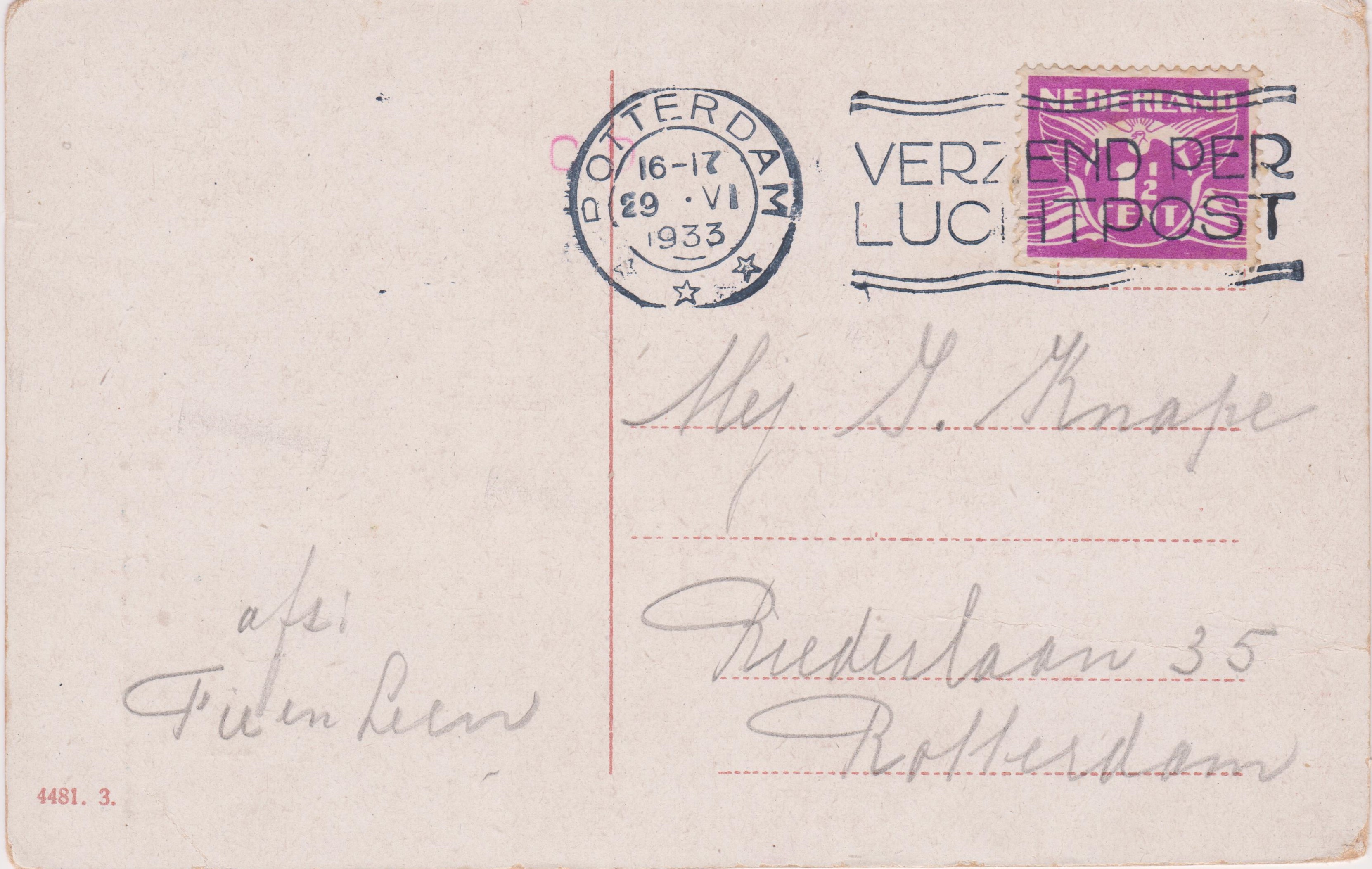 Ansichtskarte, gelaufen im Ortsverkehr von ROTTERDAM am 29.06.1933: