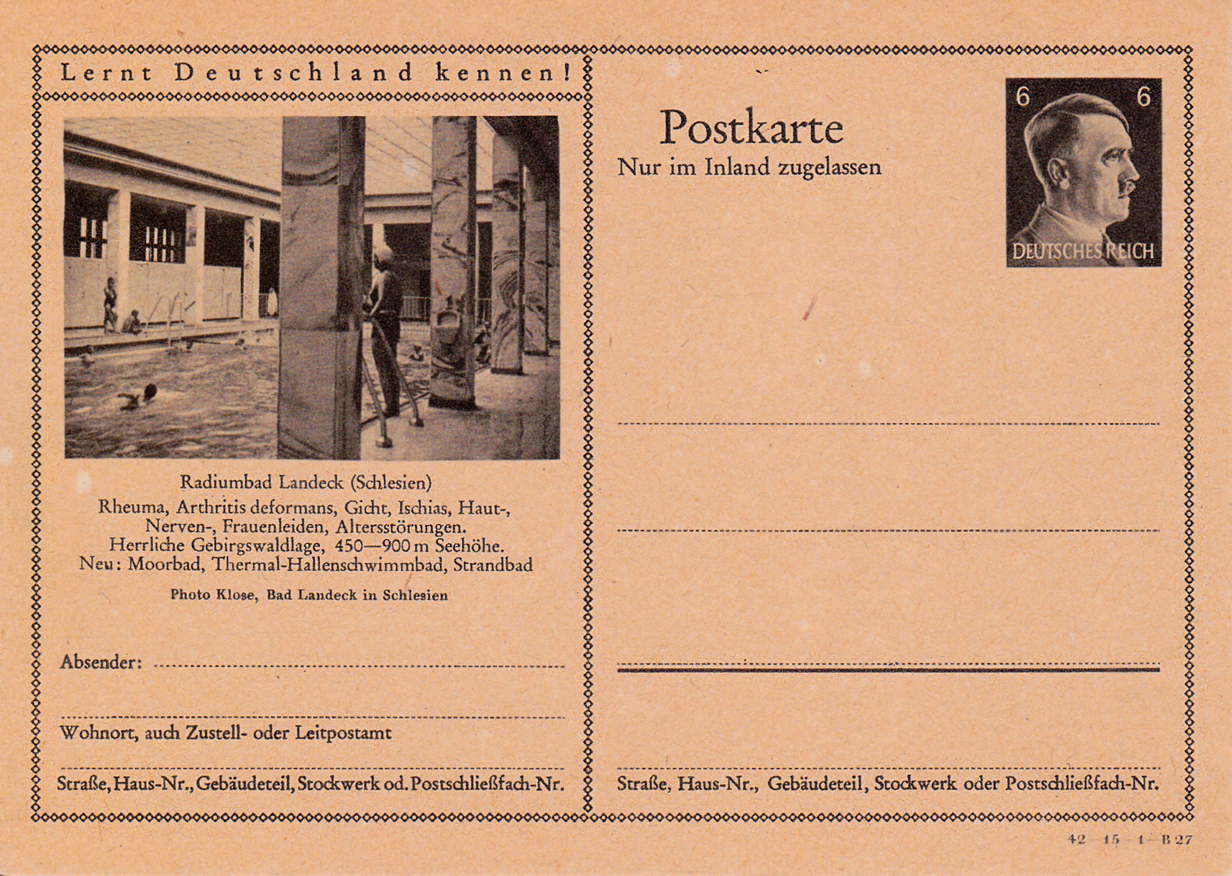 Das Radiumbad Landeck (Schlesien) wiederholt auf einerweiteren Karte (Serie 15 Bild 25) das Foto mit dem Thermal-Hallenschwimmbad aus früheren Jahren.