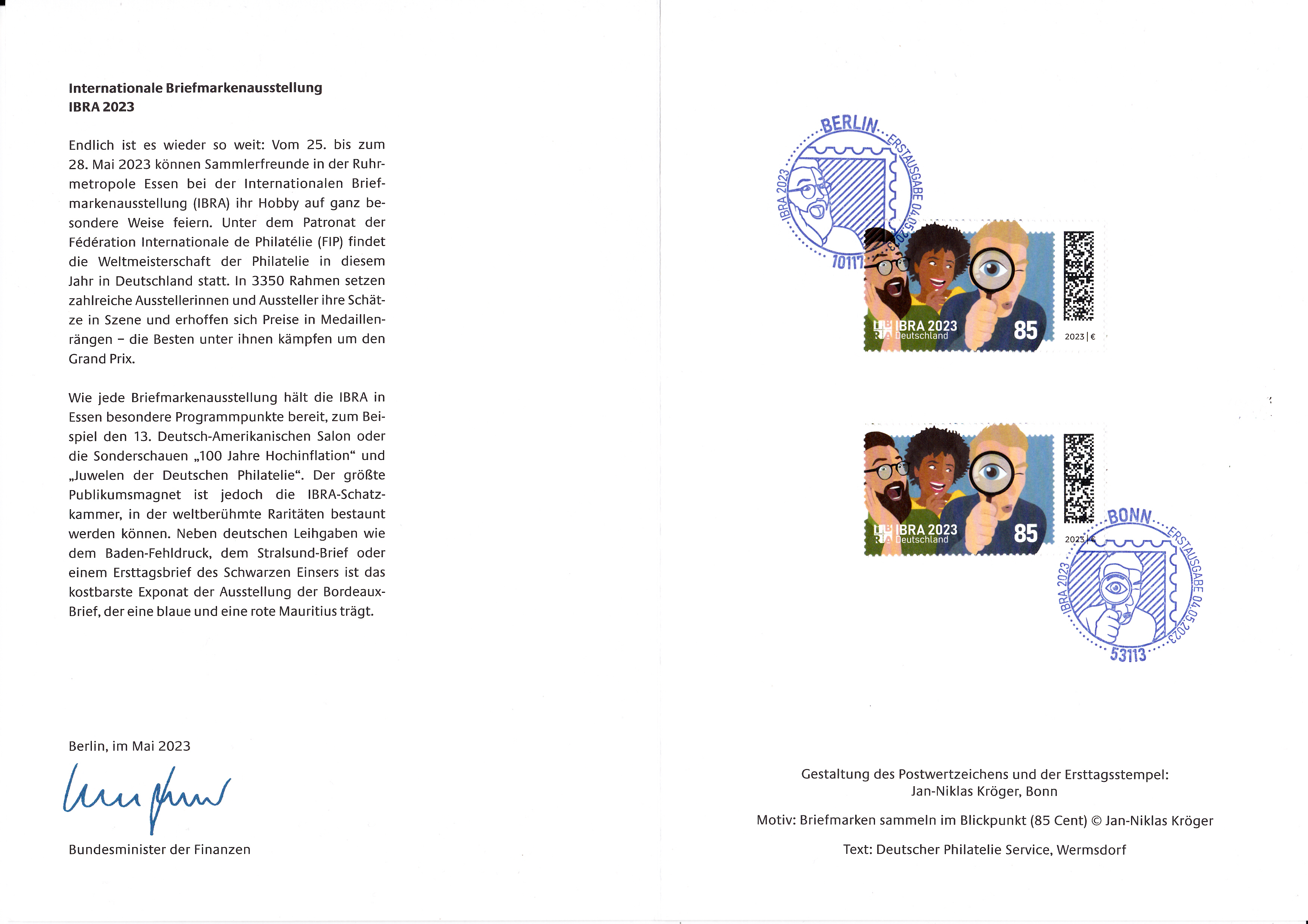 Ministerkarte des Bundesministers für Finanzen mit zwei Marken (MiNr 3783) mit dem Motiv "Wandmalerei „Past and Future“ von Claudia Walde (geb.1980) alias „MadC“, deutsche Graffiti-Künstlerin" aus der Serie "Street Art " und den beiden Ersttagsonderstempel Bonn und Berlin.