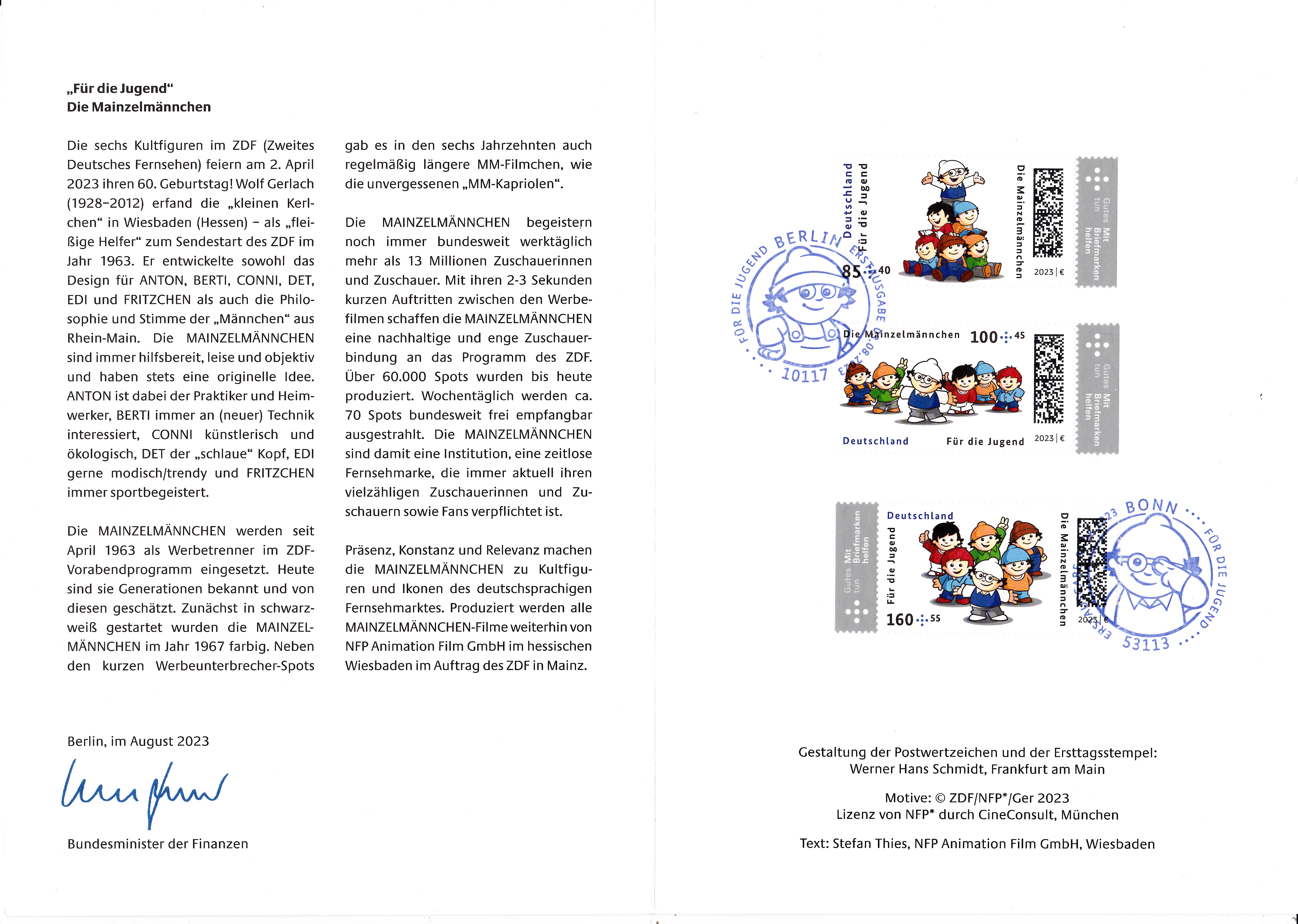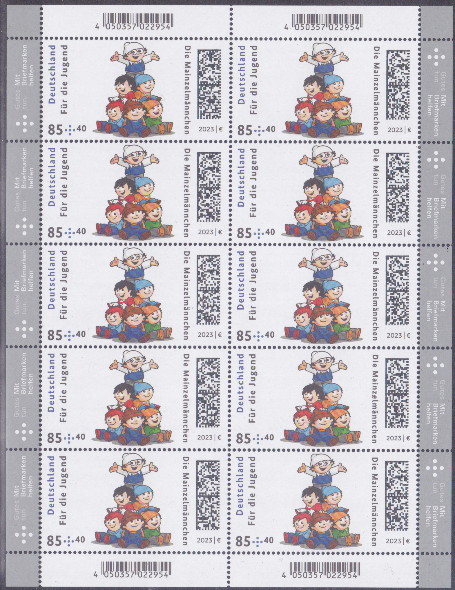 2023 sind auf den Jugendmarken der Deutschen Post Motive mit den Mainzelmännchen erschienen. Die Marke zu 85+40 Cent (MiNr 3777) zeigt die Mainzelmännchen in Pyramidenaufstellung.