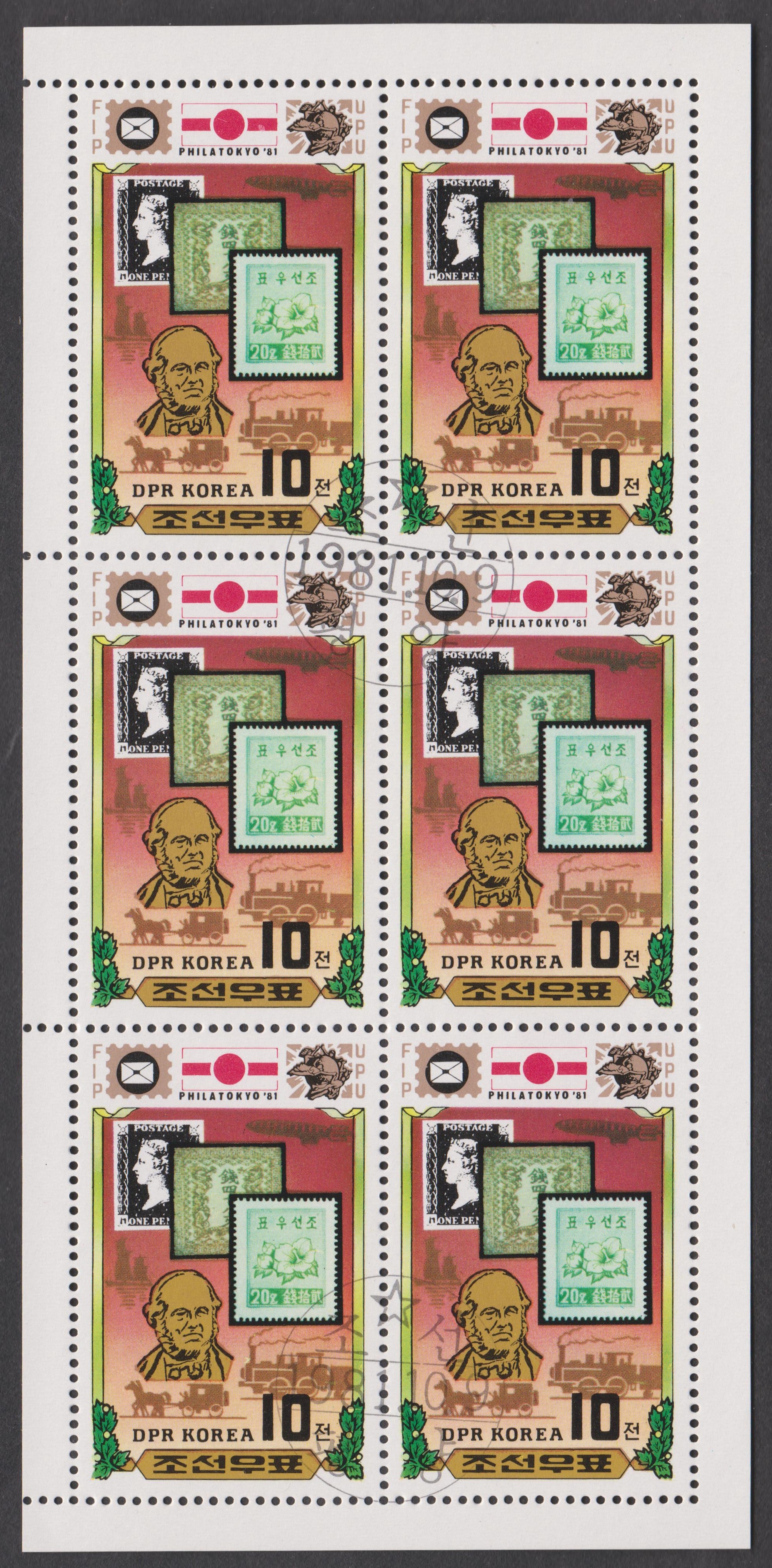 Dargestellt ist die jeweils ersten in Großbritannien, Japan sowie Nordkorea erschienenen Postwertzeichen.
