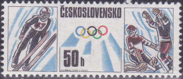 Zu den Winterspielen in Calgary ist in der Tschechoslowakei diese Marke (MiNr 2941 A) mit einem Skispringer und einer Szene beim Eishockey erschienen.