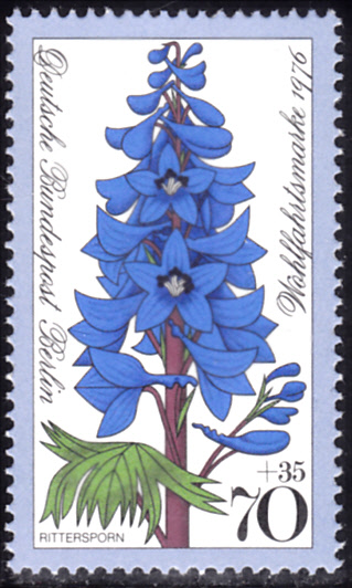 Auf einer Wohlfahrtsmarke aus Berlin wird uns eine Blüte des Hohe Rittersporn (Delphinium elatum) gezeigt.