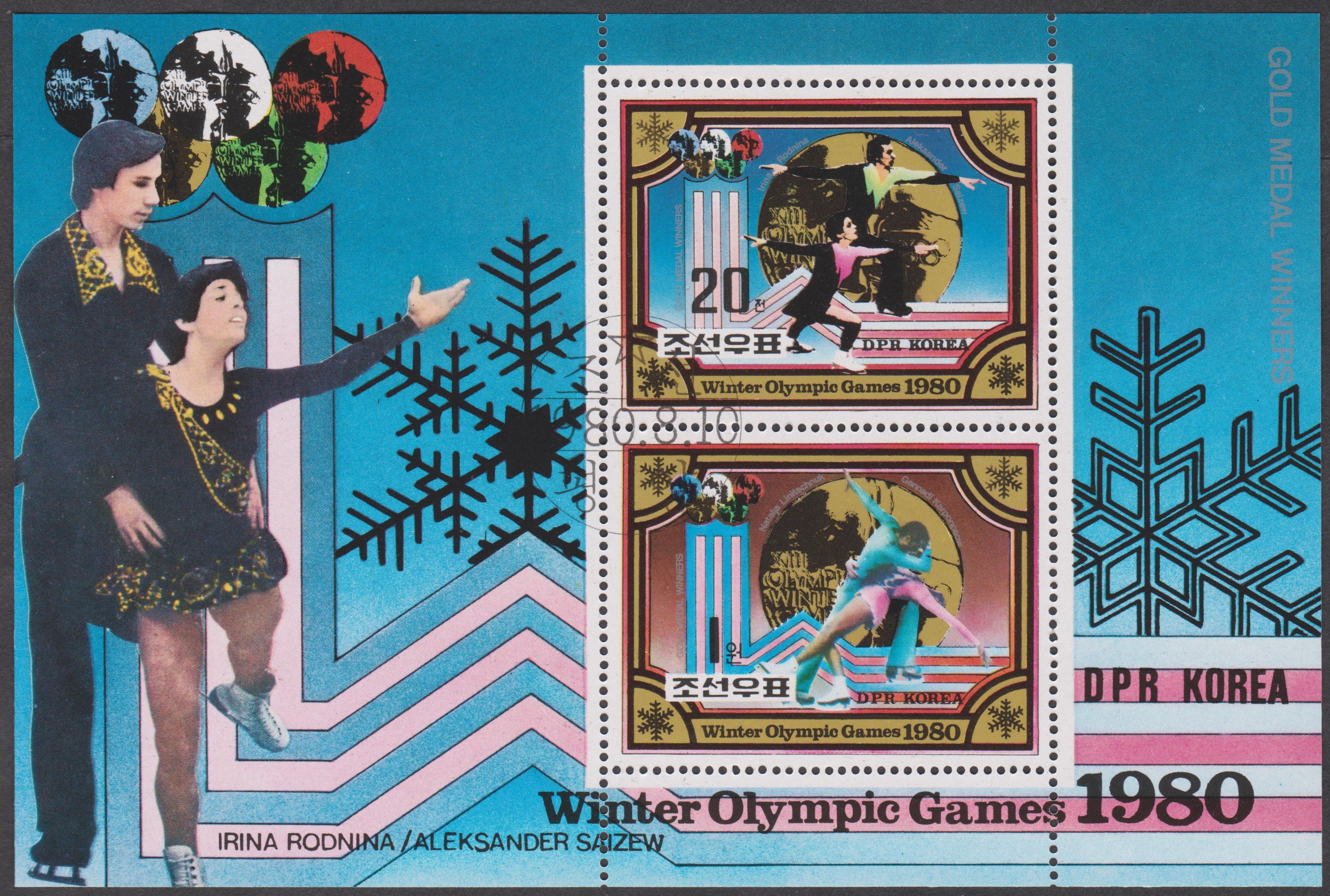 Nordkorea MiNr. 2028, hier im Neuner-Kleinbogen zeigt die Goldmedaillengewinner im Paarlauf der Eiskunstläufer, Irina Rodnina / Alexander Saizew: