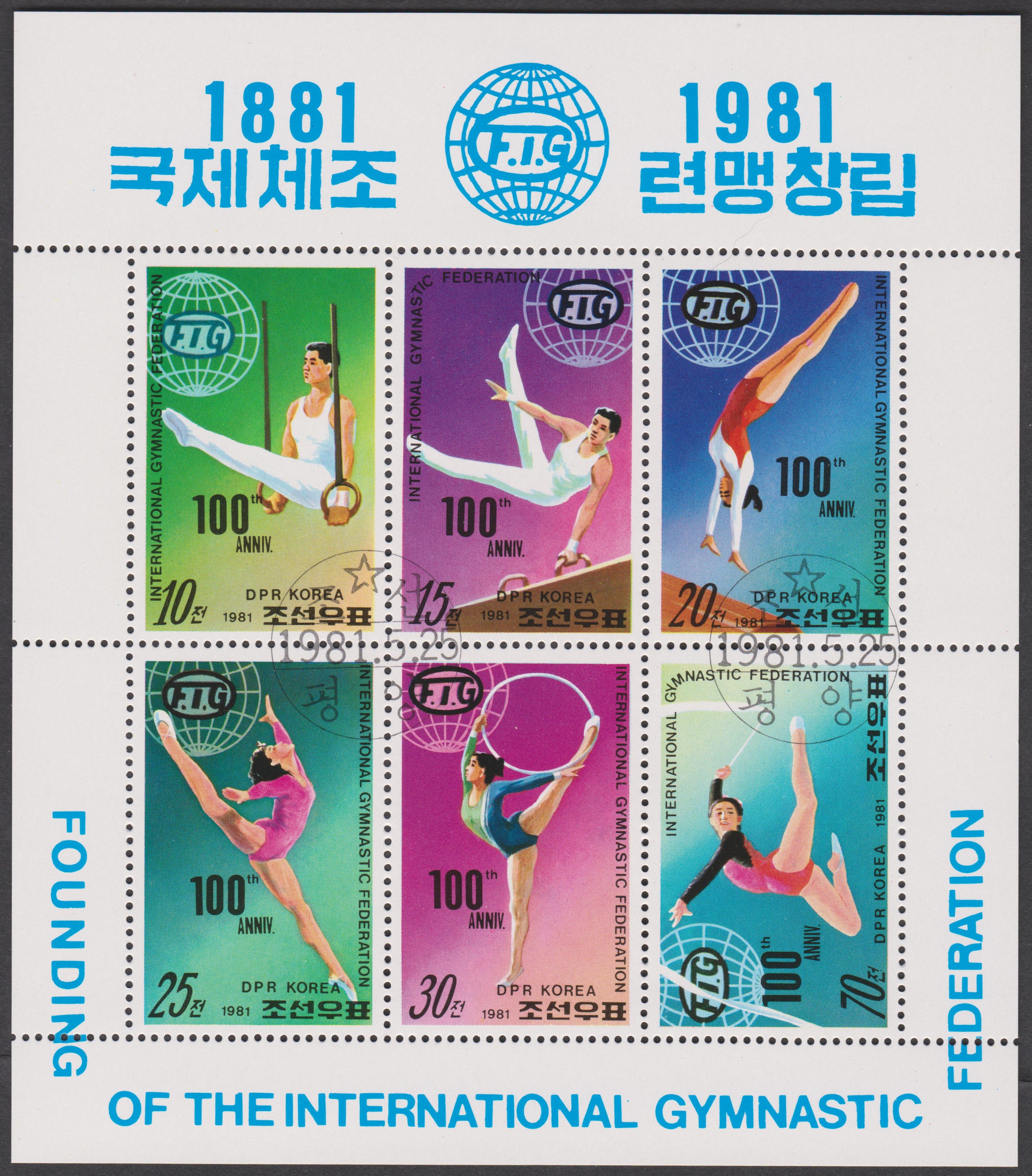 Dieser Block 98 A von Nordkorea mit MiNr. 2130 - 2135 erschien am 25.05.1981 aus Anlaß 100 Jahre Internationaler Turnerverband F. I. G.: