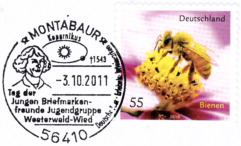 Sonderstempel aus Montabaur vom 3.10.2011 zum "TdJB" mit einem Porträt von Nikolaus Kopernikus und der Sonne mit der Umlaufbahn eines Planeten.
