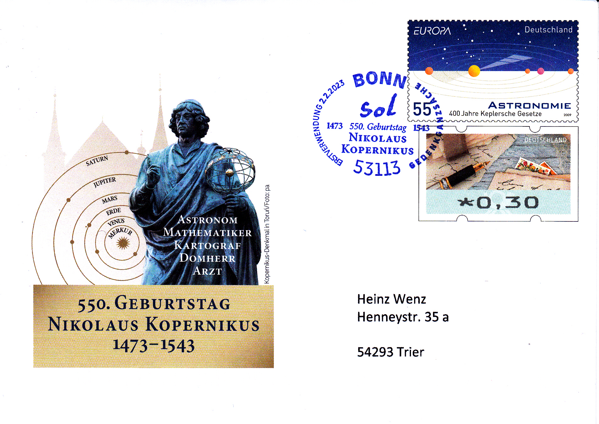 Zum 550. Geburtstag von Nikolaus Kopernikus erschien bei der Deutschen Post ein Gedenkumschlag mit dem Werteindruck im Muster der Europamarke von 2009 (MiNr 2732) und einer Automatenmarke zu 0,30€.