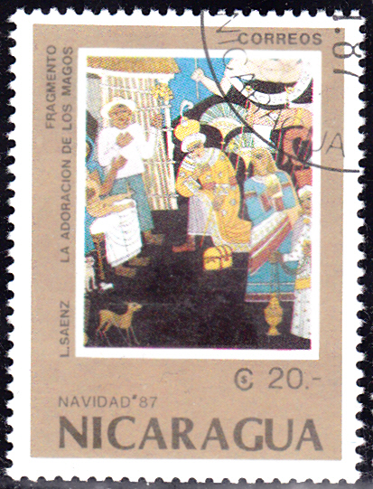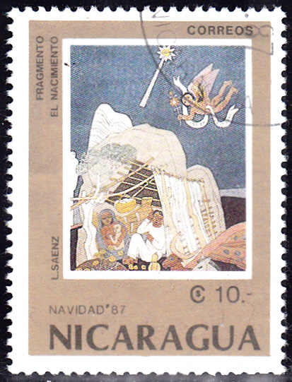 Die Weihnachtsmarken 1987 aus Nicaragua (MiNr 2838 bis 2842) zeigen Gemälde von L. Saenz.