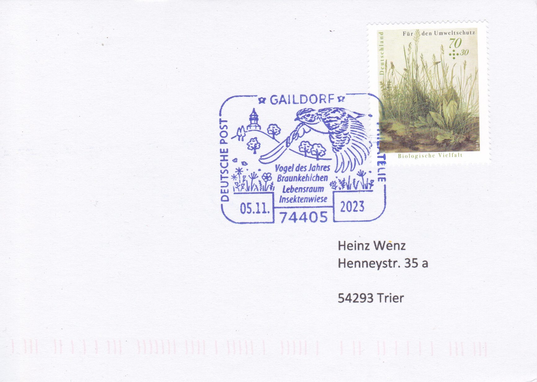 Sonderstempel vom 5.11.2023 aus Geildorf mit einem fluegenden Braunkehlchen (Saxicola rubetra).